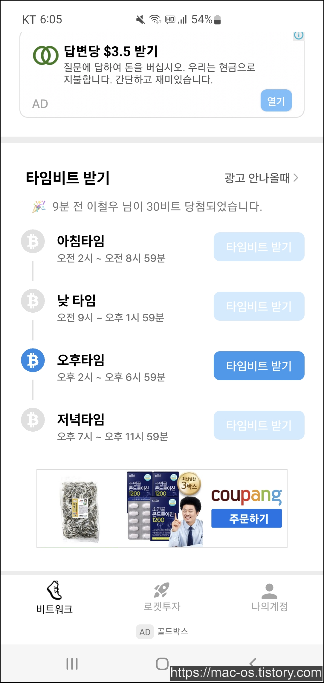 아래로 더 내려보면 타임비트라는 것이 있는데요. 타임비트는 아침타임, 낮타임, 오후타임, 저녁타임 이렇게 특정 시간마다 타임비트 받기 버튼을 누르고 광고를 시청하면 비트를 주는 기능입니다.