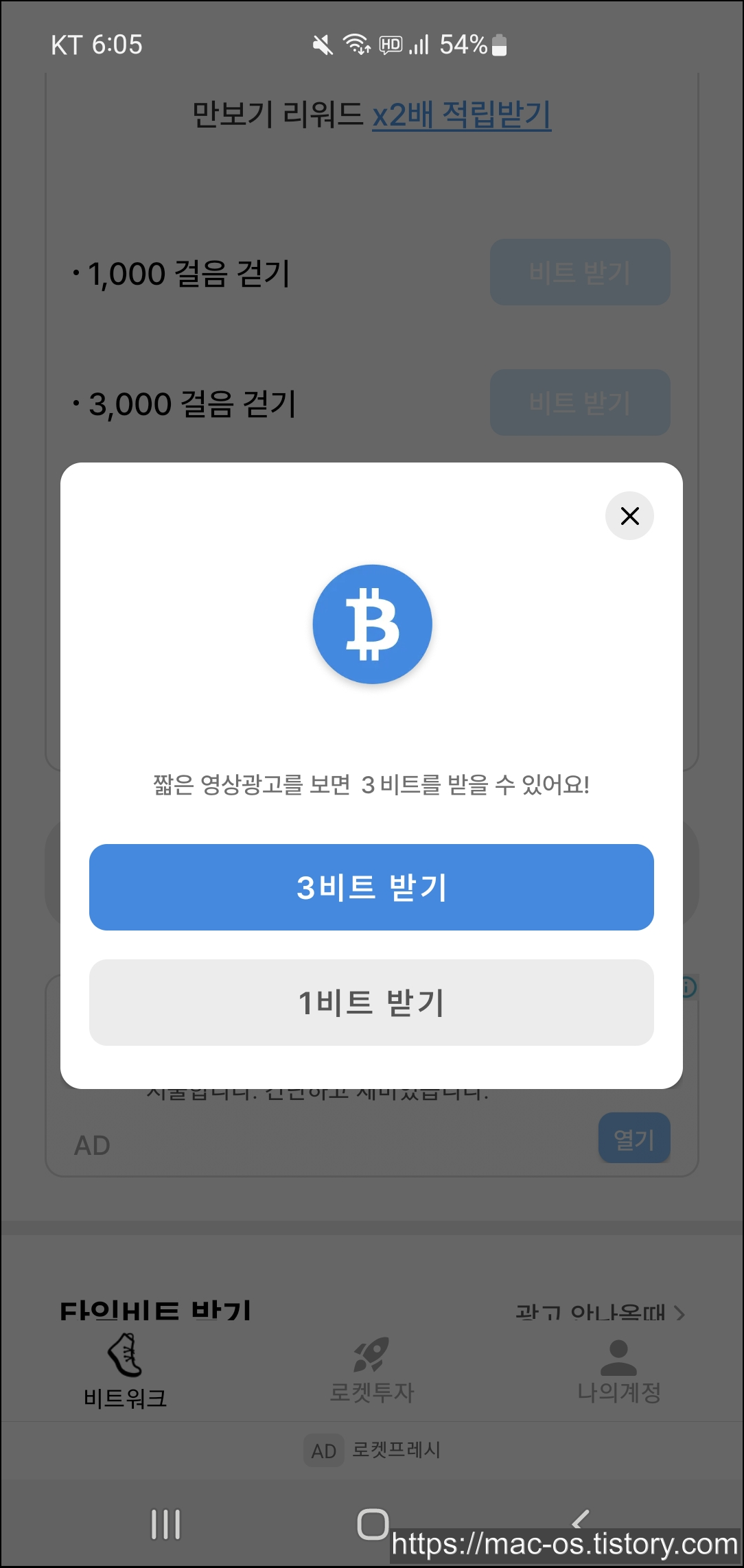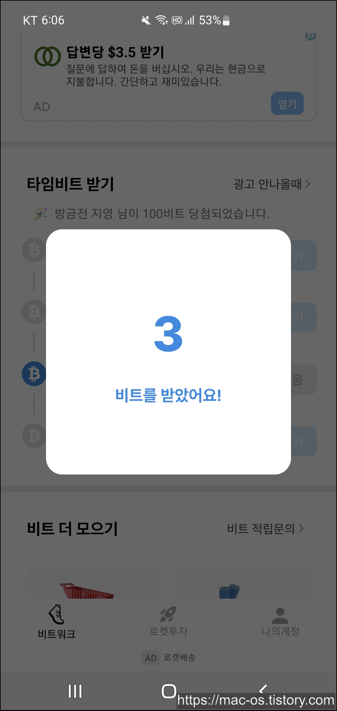 아래로 내려보면 보너스 비트받기 라는 것도 있는데, 짧은 광고 영상을 보면 3비트를 줍니다.