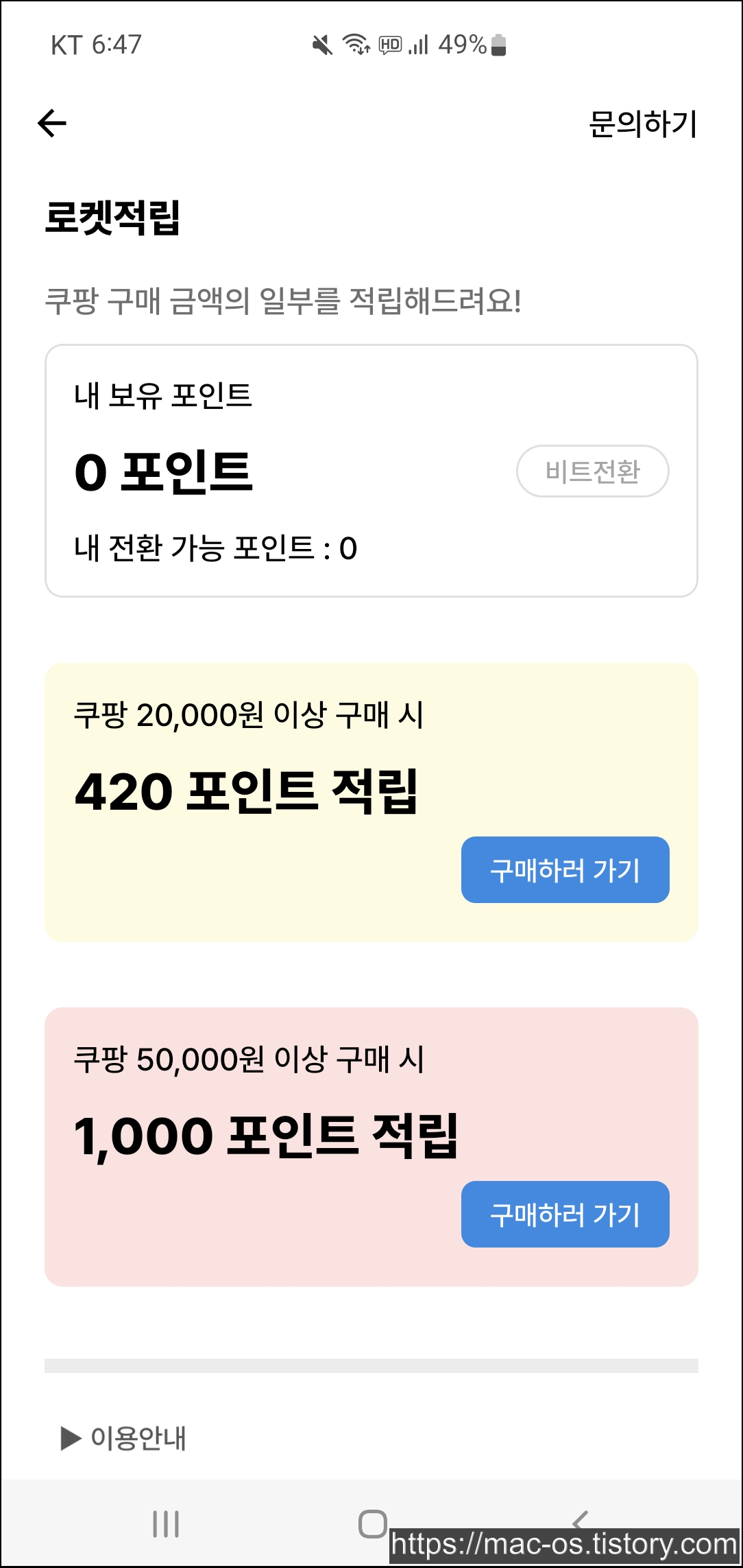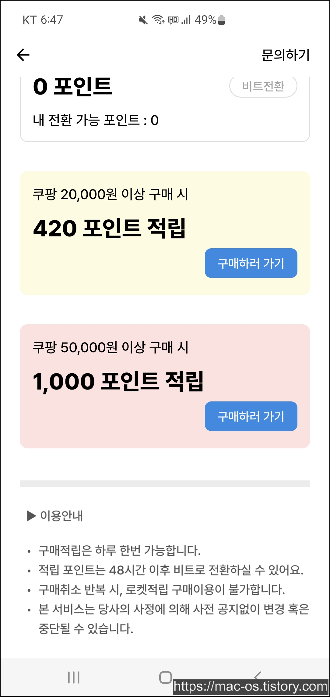 로켓적립이라는 것도 있는데요. 쿠팡에서 구매한 금액의 일부를 비트로 적립해주는 기능입니다. 2만원 이상 구매 시 420포인트, 5만원 이상 구매 시 1000포인트인데, 구매하러 가기를 눌렀을 때 나오는 쿠팡 상품을 구매해야하는건지, 아니면 내가 원하는 상품을 구매해도 되는 건지 잘 모르겠네요. 아마 후자겠죠?