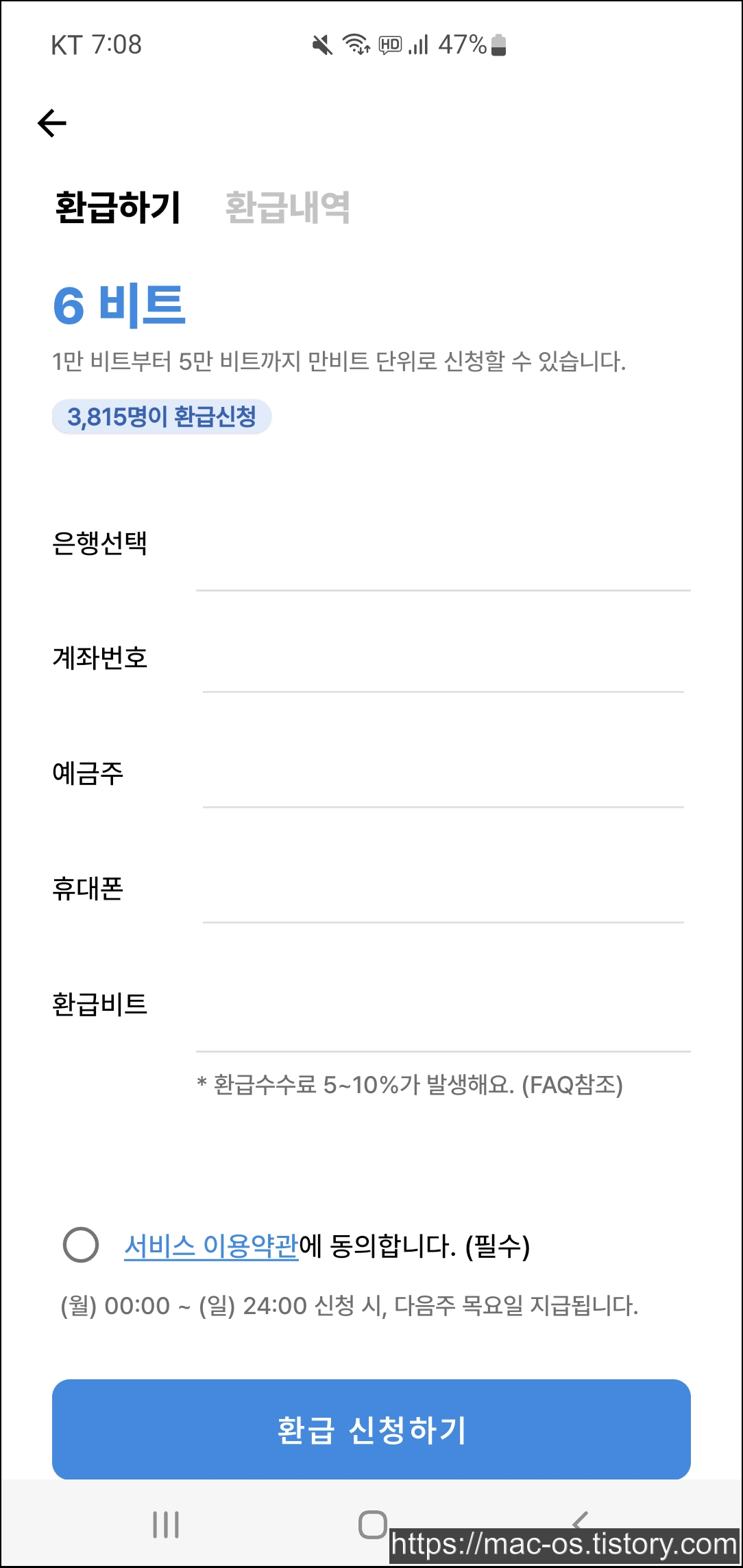비트워크에서 얻은 비트는 쿠폰받기와 현금환급 버튼을 눌러서 사용할 수 있습니다. 쿠폰받기에선 기프티콘을, 현금환급에선 1만 비트부터 5만 비트까지 1만 단위로 신청할 수 있구요. 환급 수수료 5~10%가 발생한다고 하네요.