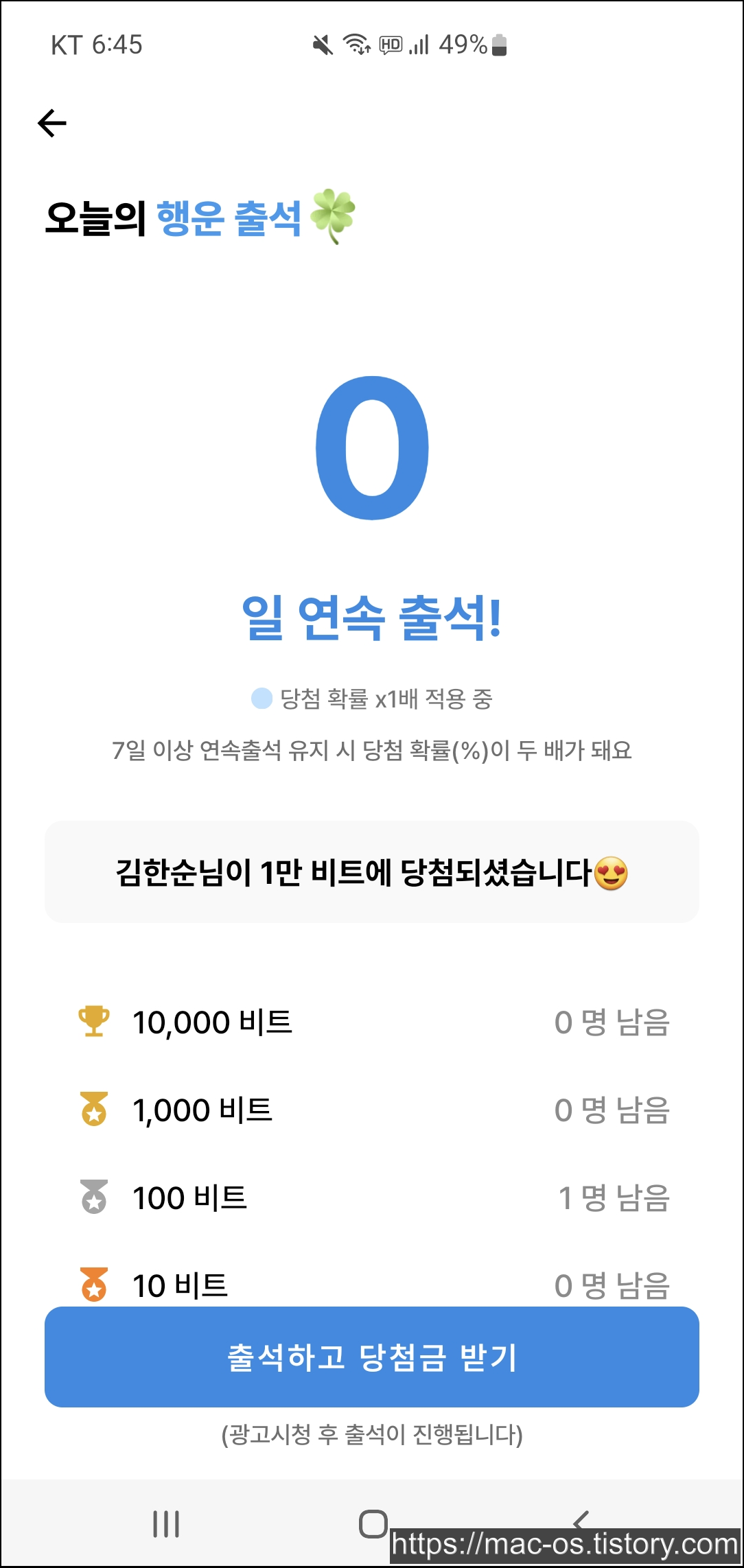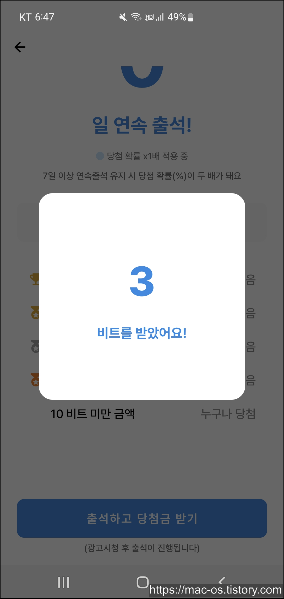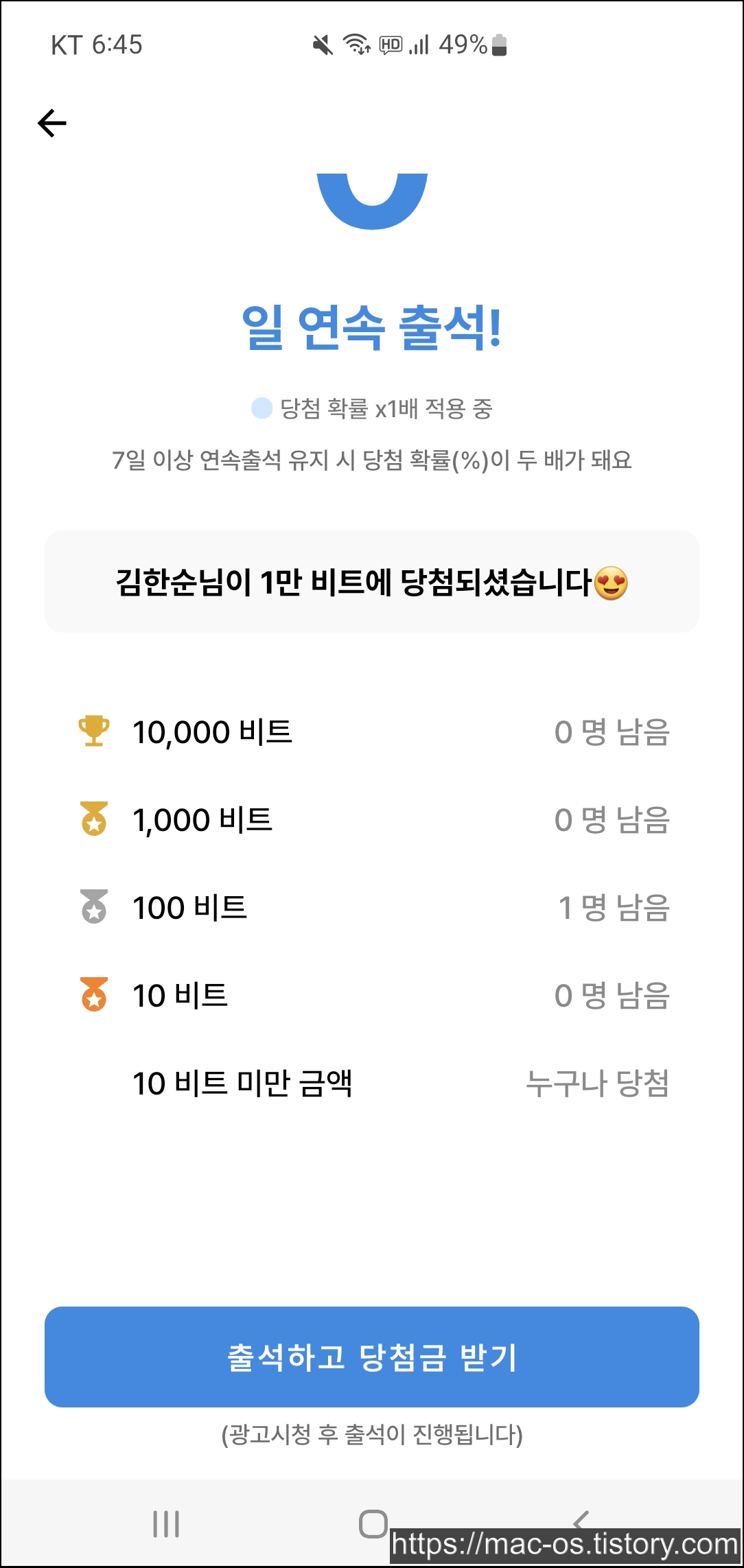 출석하고 당첨금 받기 버튼을 누르면 광고가 나오는데 이걸 끝까지 보면 10비트 미만 금액부터 1만 비트까지 나옵니다. 그런데 인원수가 정해져 있네요. 7일이상 출석을 연속으로 유지하면 당첨 확률도 증가한다고 하니 낮은 비트의 당첨자 수가 남아있어도 출석은 하는 게 좋겠습니다.