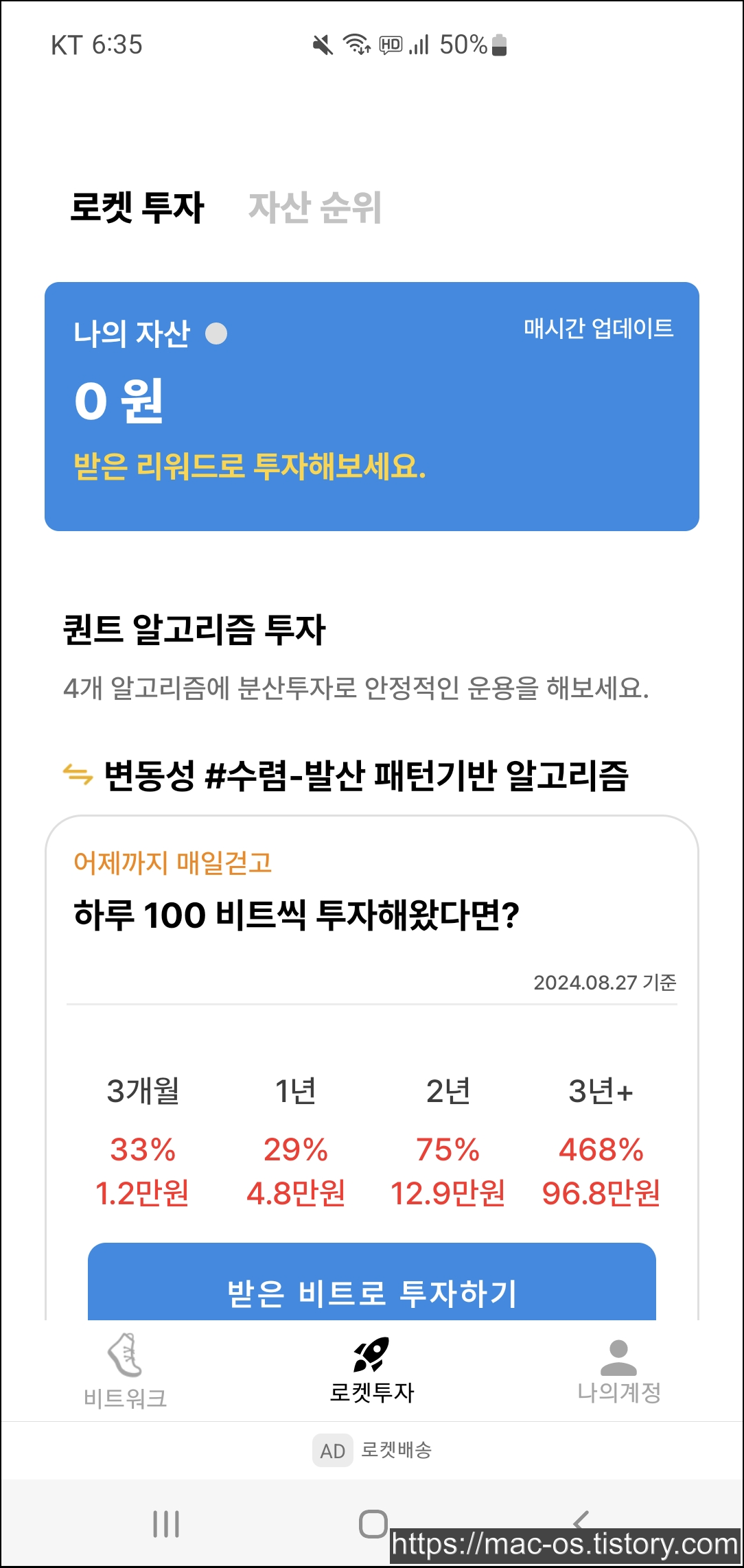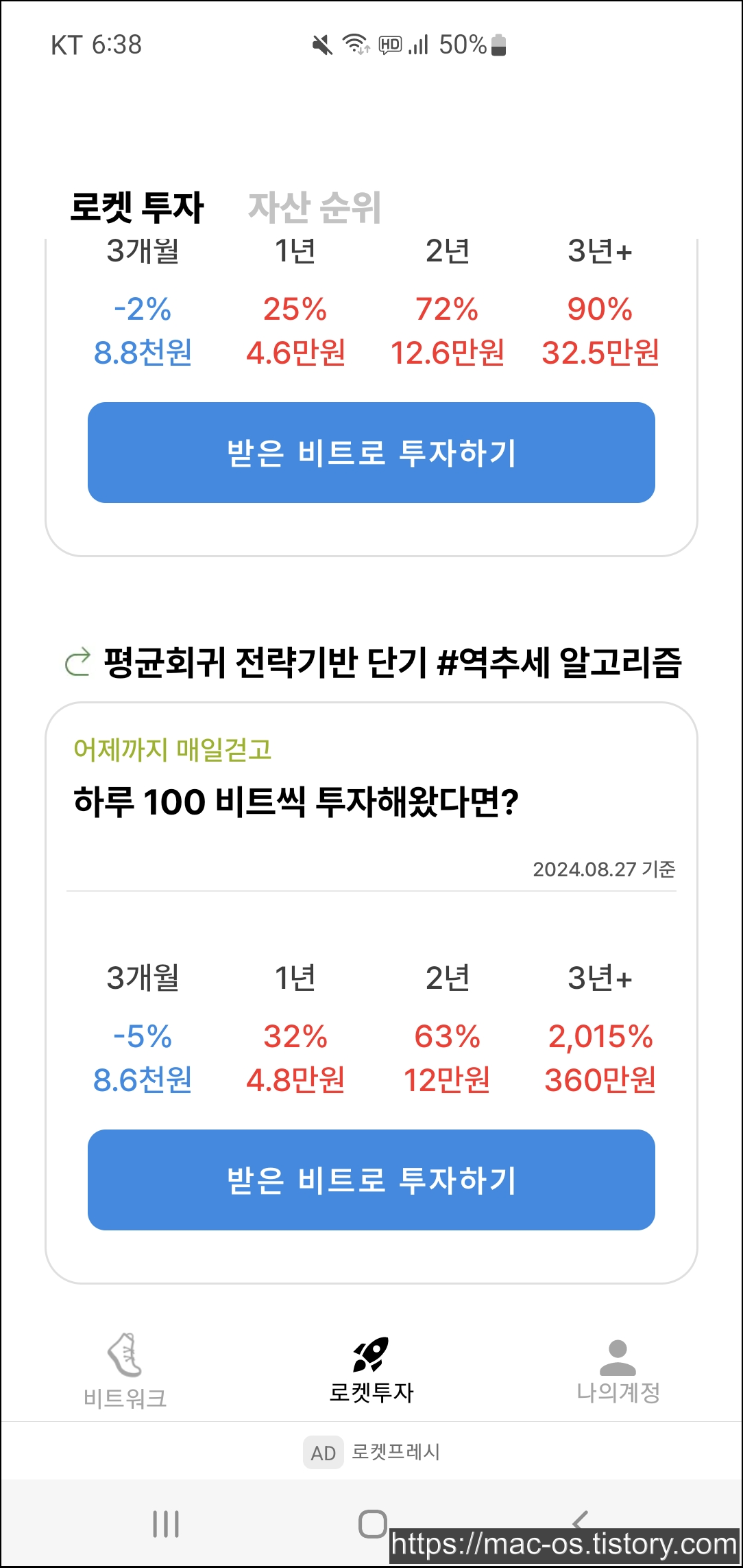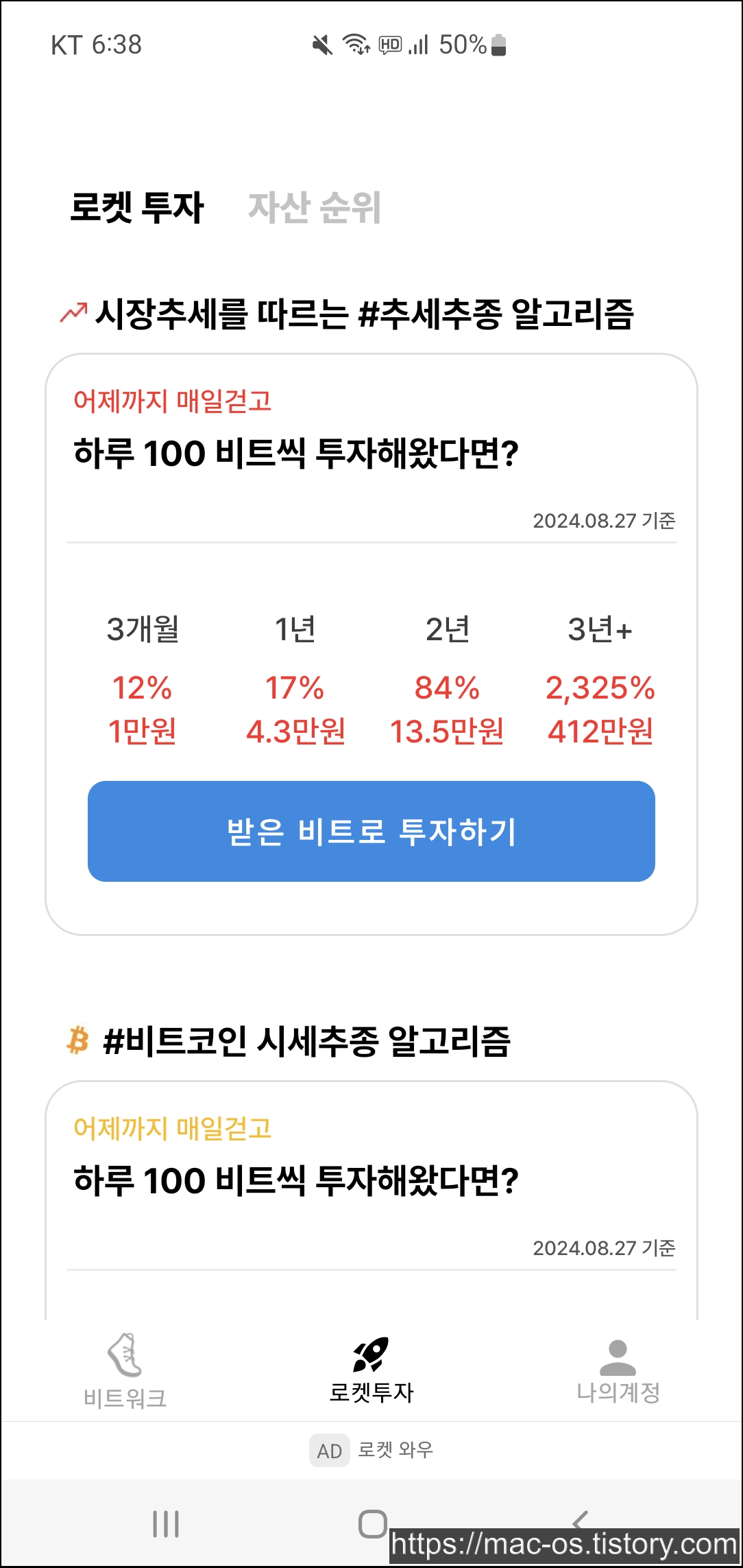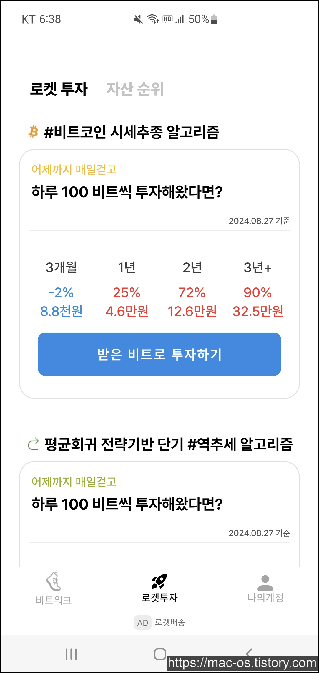 비트워크의 특별한 기능, 로켓투자에 대해 설명해드리려고 합니다. 로켓투자는 자신이 가지고 있는 비트를 사용해 주식처럼 투자하는 기능인데요. 시장추세를 따르는 추세추종 알고리즘이나 비트코인 시세추종 알고리즘 이렇게 다양한 알고리즘이 있습니다.
