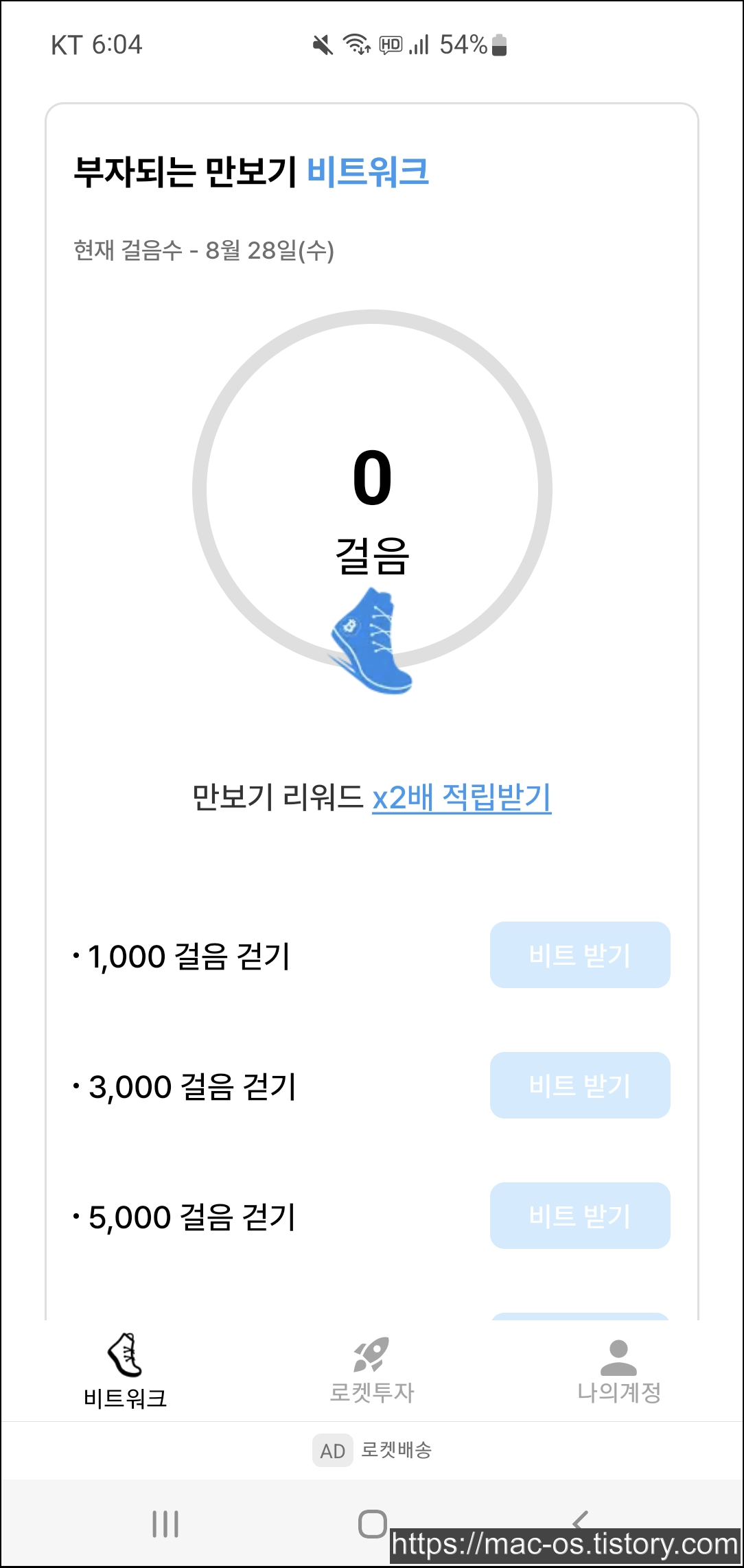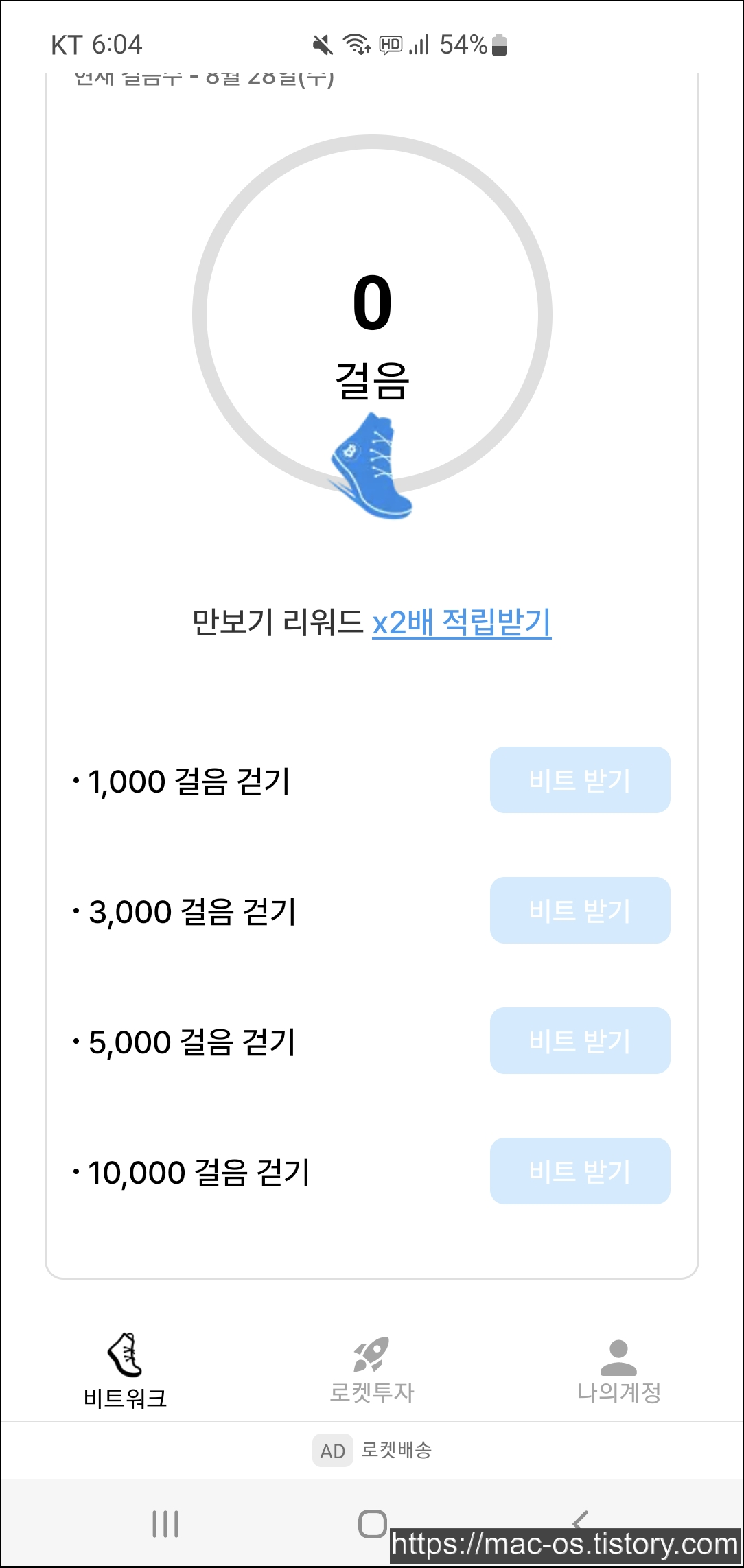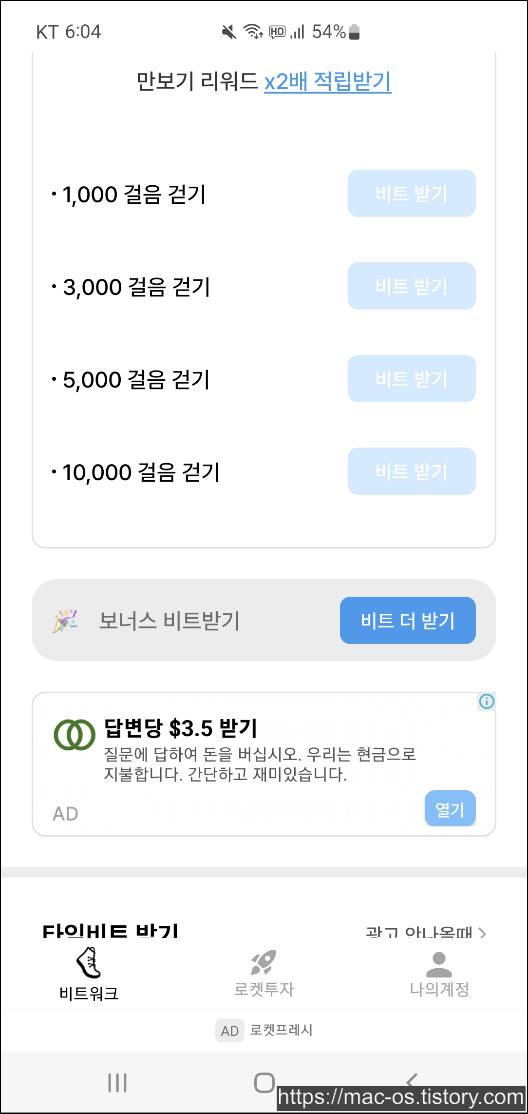 그럼 비트워크의 기능에 대해 살펴보겠습니다. 우선 1000/3000/5000/10000 걸음을 걸을 때마다 비트 받기 버튼을 눌러서 비트를 받을 수 있는데요. 비트는 랜덤으로 나오는 듯 합니다.