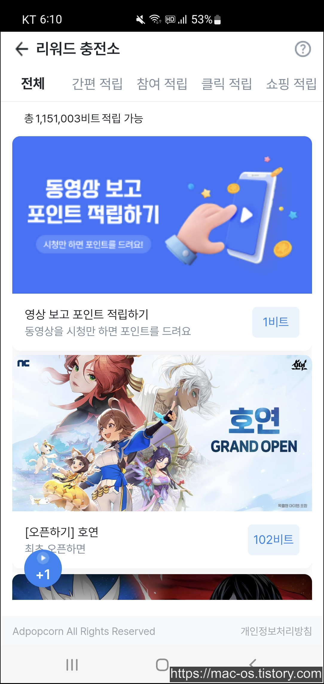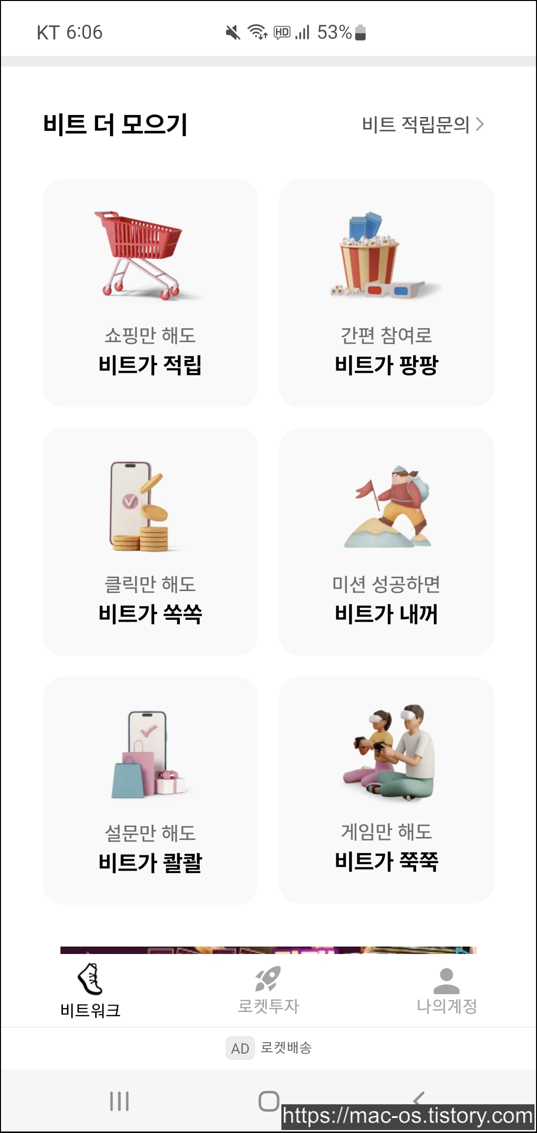 아래로 끝까지 내려보면 비트 더 모으기라는 것이 있습니다. 순서대로 비트가 적립을 눌러보면 오른쪽 사진과 같은 광고 충전소가 나옵니다.