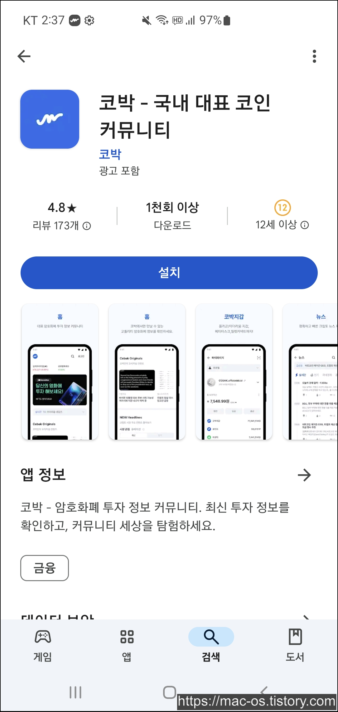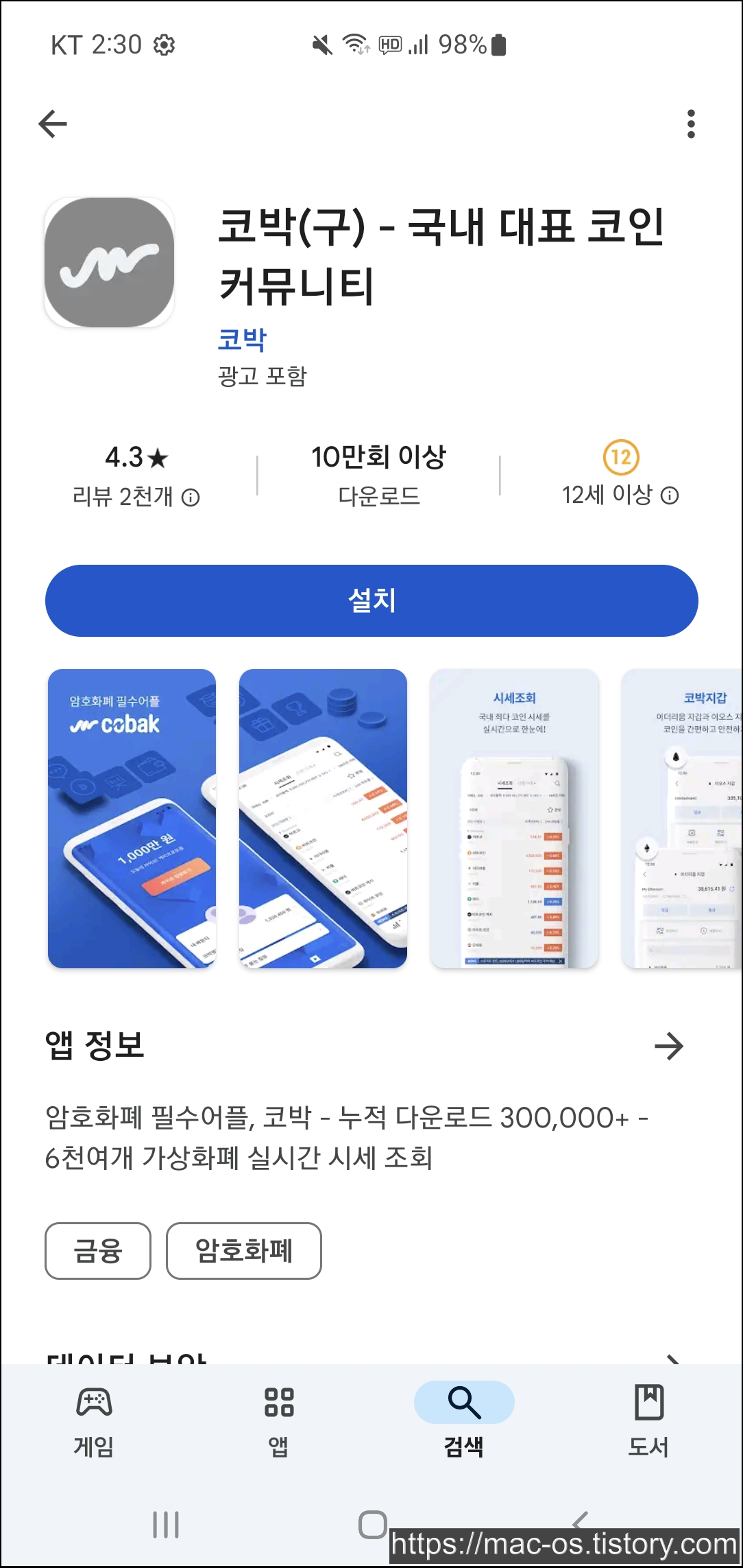 구글 플레이 스토어에서 코박(구) 앱을 먼저 설치하고 실행합니다.