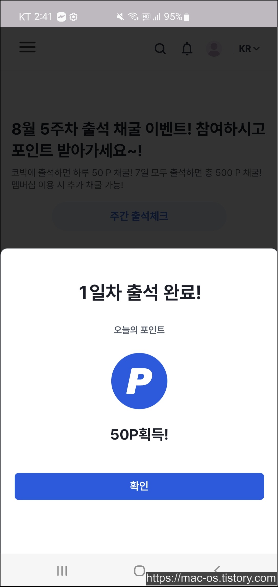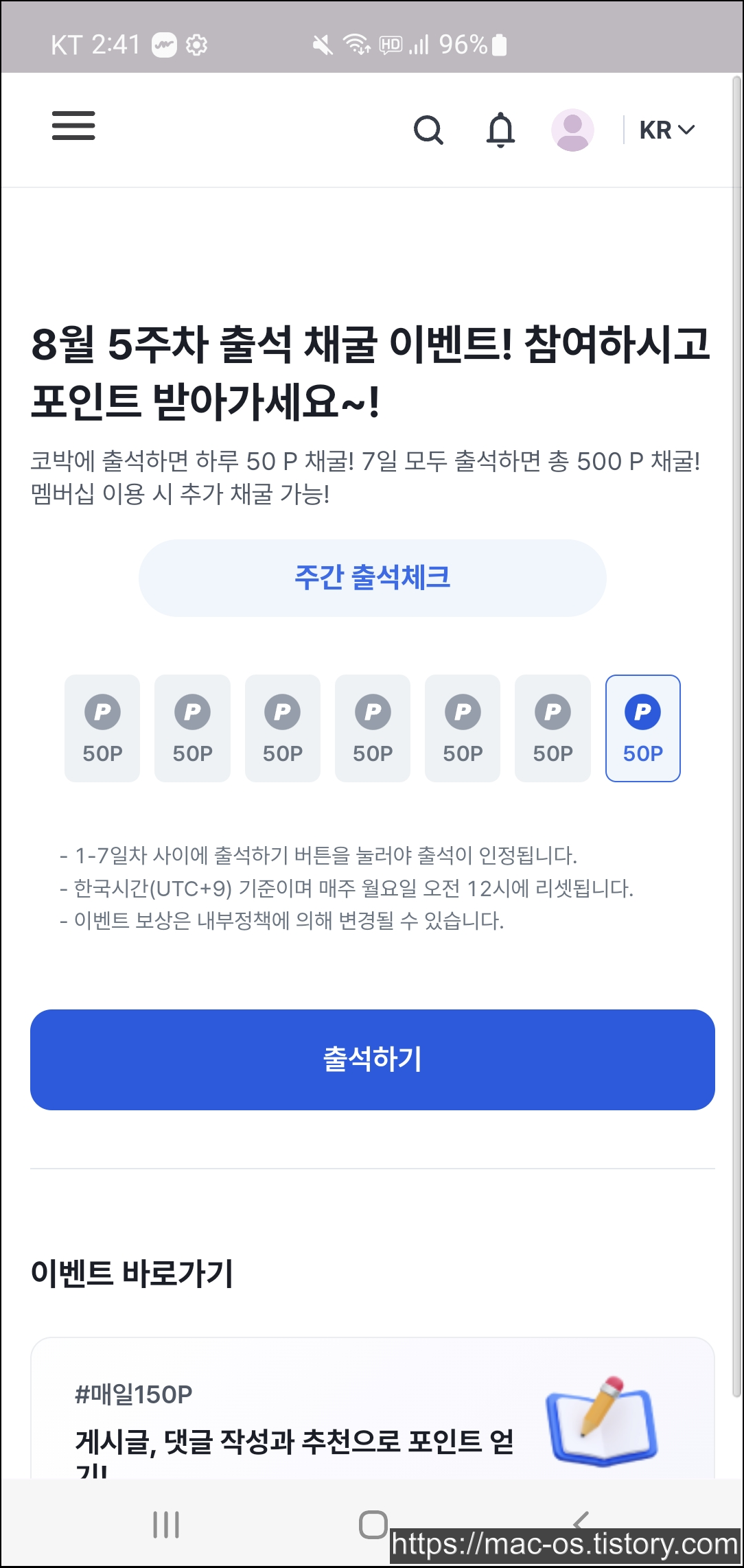 그럼 이제 코박에서 포인트를 얻는 방법을 살펴보겠습니다. 코박에는 출석체크가 있는데, 하루에 출석을 하면 50포인트를 받을 수 있고, 7일 모두 출석하면 총 500포인트를 채굴할 수 있습니다.