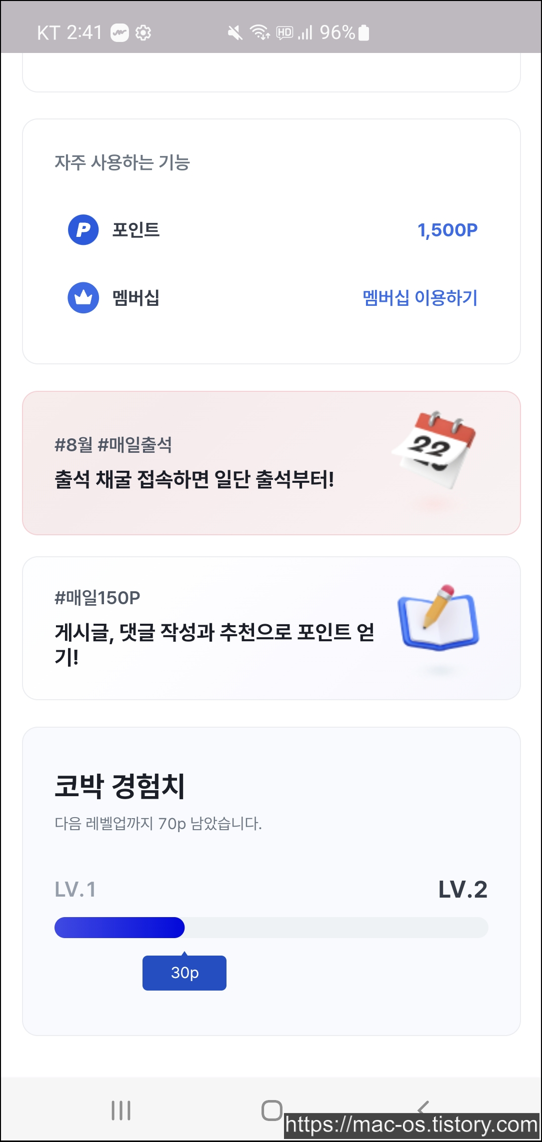 추천인 코드를 입력했다면 다시 플레이 스토어로 와서 코박 앱을 설치하고 실행합니다. 아까 코박(구)에서 연동한 계정으로 로그인하면 1500포인트가 있는 것을 확인할 수 있습니다.