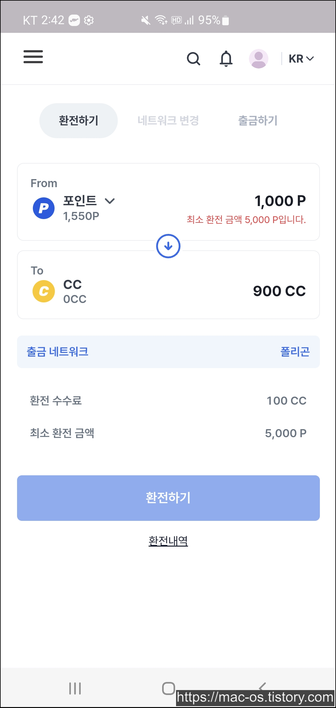 출석체크와 일일 퀘스트를 계산하면 하루에 200포인트니까 한달에 6000포인트 정도를 얻을 수 있는데요. 코박에서 얻은 포인트는 환전 페이지에서 CC라는 코인으로 환전할 수 있습니다.