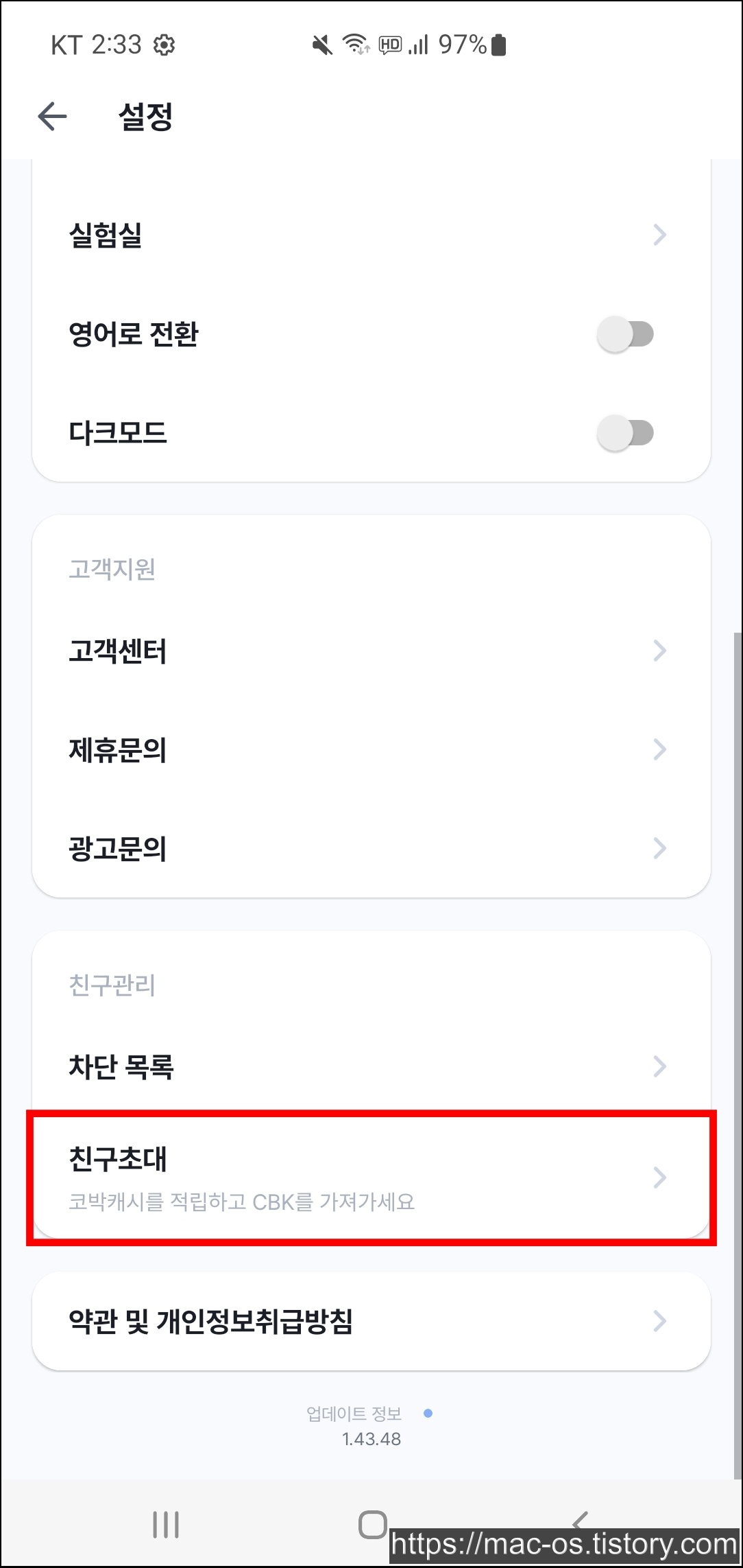 설정 페이지에서 아래로 내려서 친구초대를 터치합니다.