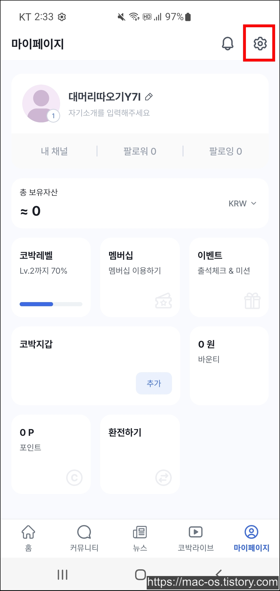 카카오, 네이버, 애플, 구글, 이메일 원하는 방법을 선택해 로그인을 진행합니다. 로그인을 하고 나서 우측 상단의 톱니바퀴를 눌러 설정 페이지로 이동합니다.