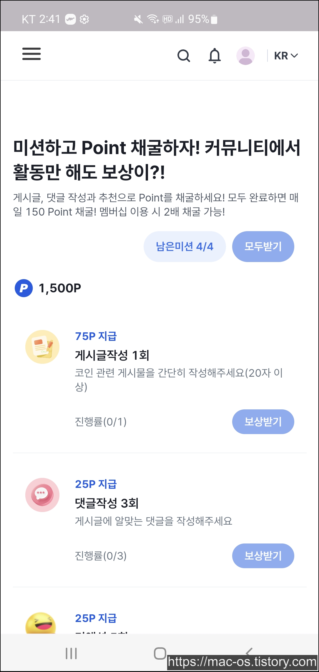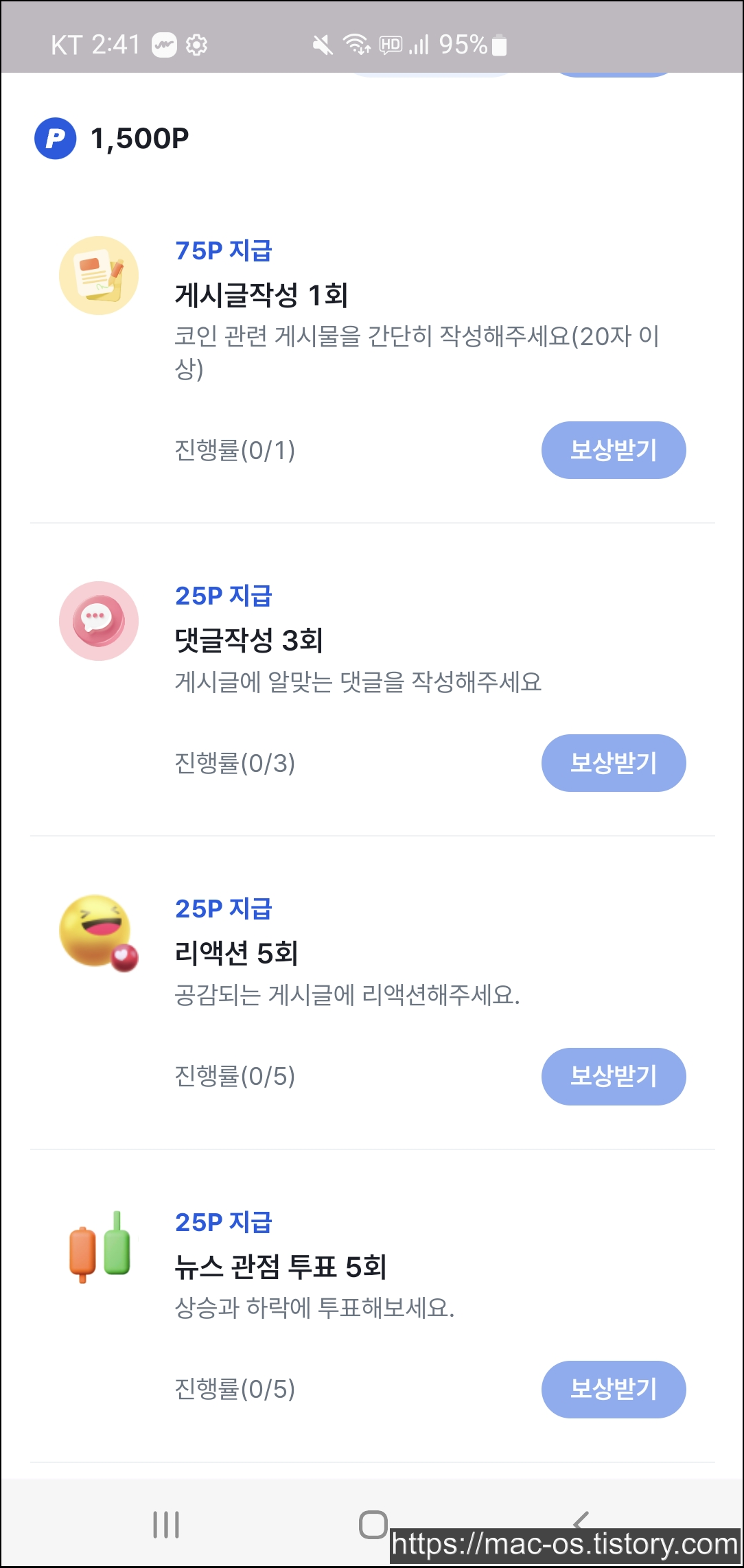 코인 관련 게시글(20자 이상)을 1회 작성하면 75포인트, 게시글에 알맞는 댓글을 3회 작성하면 25포인트, 공감되는 게시글에 리액션 5회 하면 25포인트, 상승과 하락을 투표하는 뉴스 관점 투표 5회 하면 25포인트, 이렇게 하루에 총 150포인트를 얻을 수 있습니다.