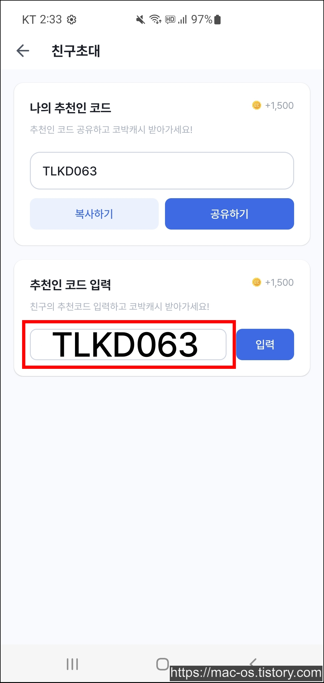 친구초대 페이지에서 추천인 코드 입력 칸에 TLKD063를 복사해서 입력하면 1500포인트를 받을 수 있습니다.