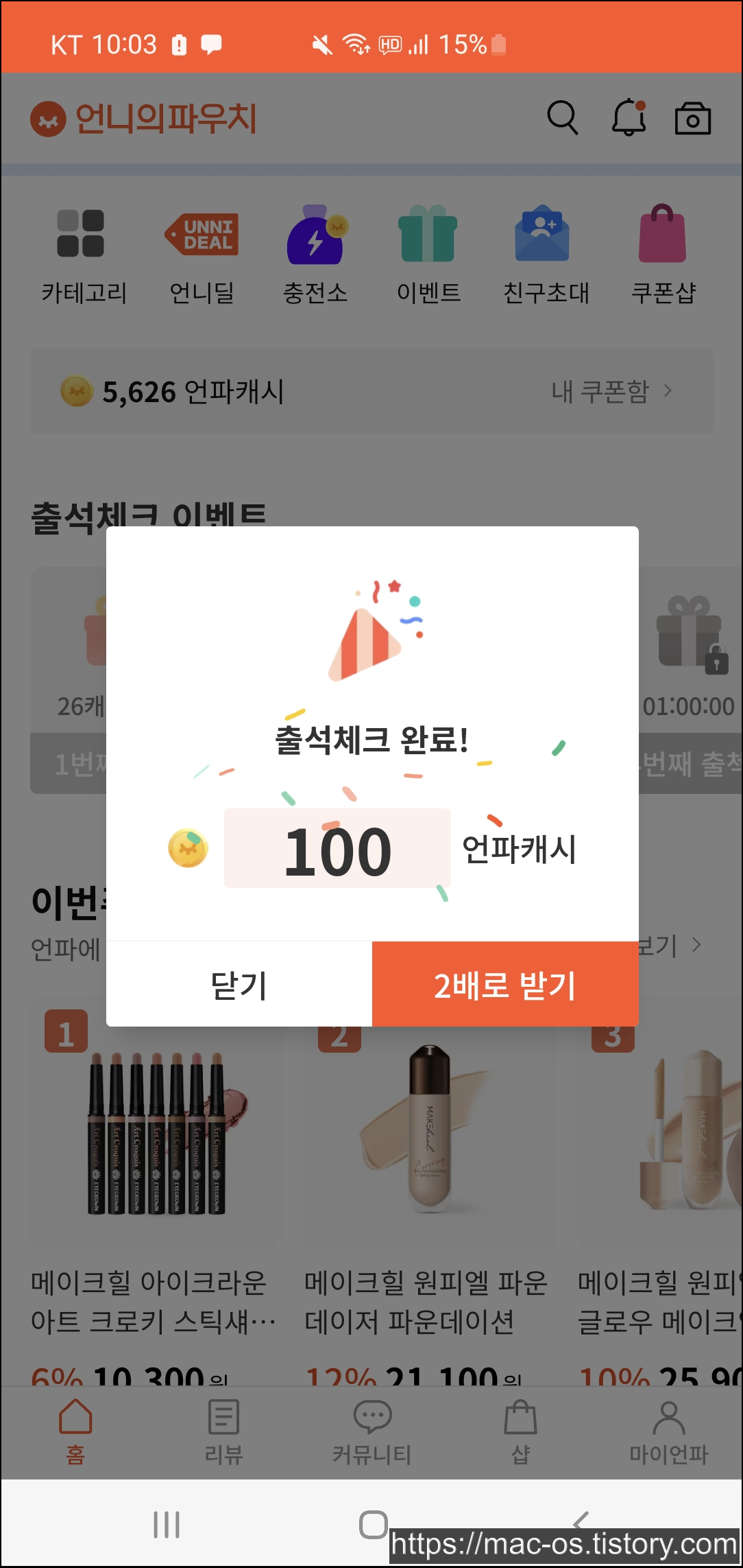 홈 화면에서 출석체크 이벤트라는 것을 볼 수 있는데, 출석체크를 누르면 1~999캐시 랜덤으로 나오는 듯 합니다.