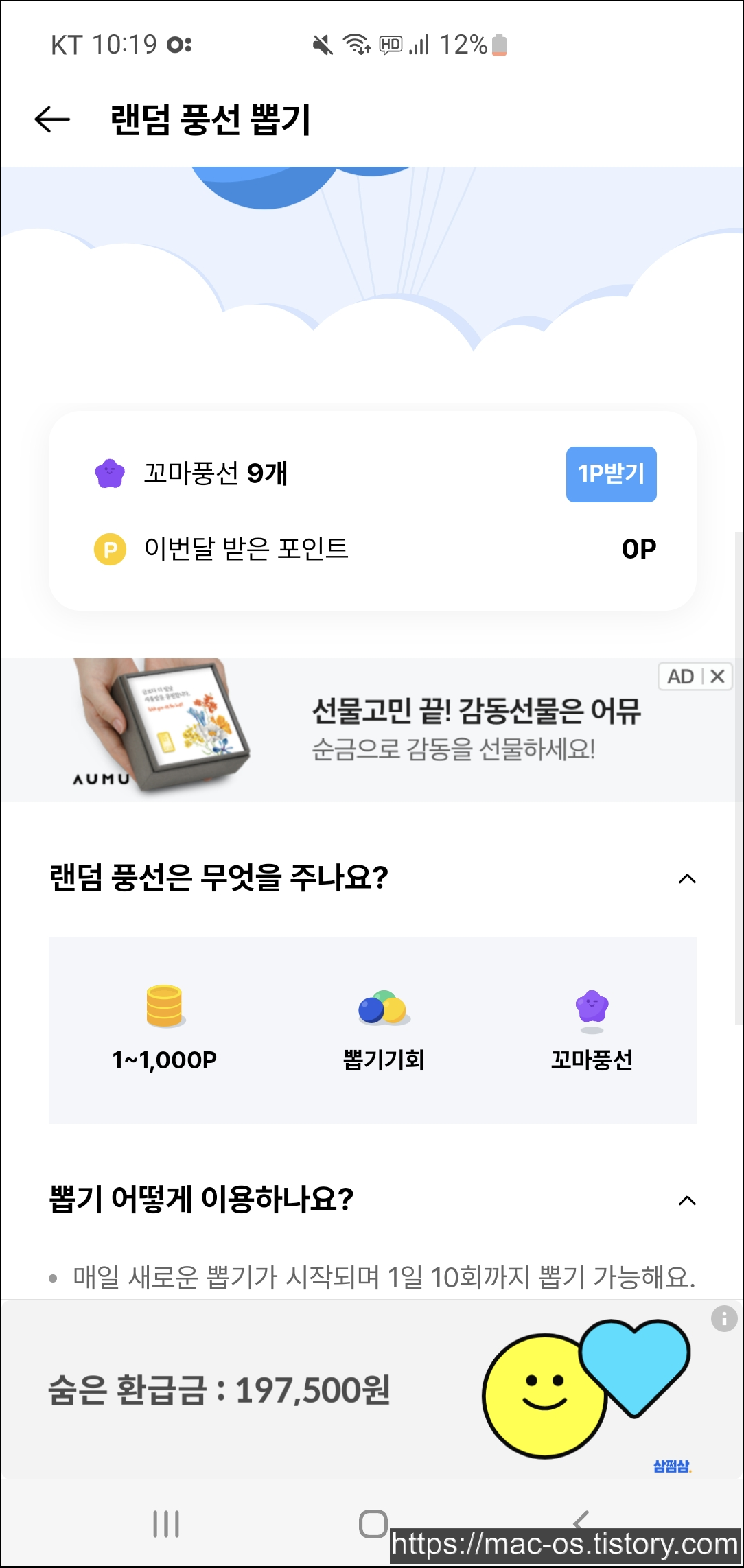 광고를 시청해서 하루에 최대 3회까지 뽑기 기회를 충전할 수 있고, 뽑기를 통해 꼬마풍선 5개를 모으면 1포인트를 받을 수 있습니다. 제가 아까 받은 꼬마풍선 5개가 사실은 1포인트인 것 같네요.. 아마 랜덤으로 꼬마풍선 수십 수백개가 나오기도 하겠죠?