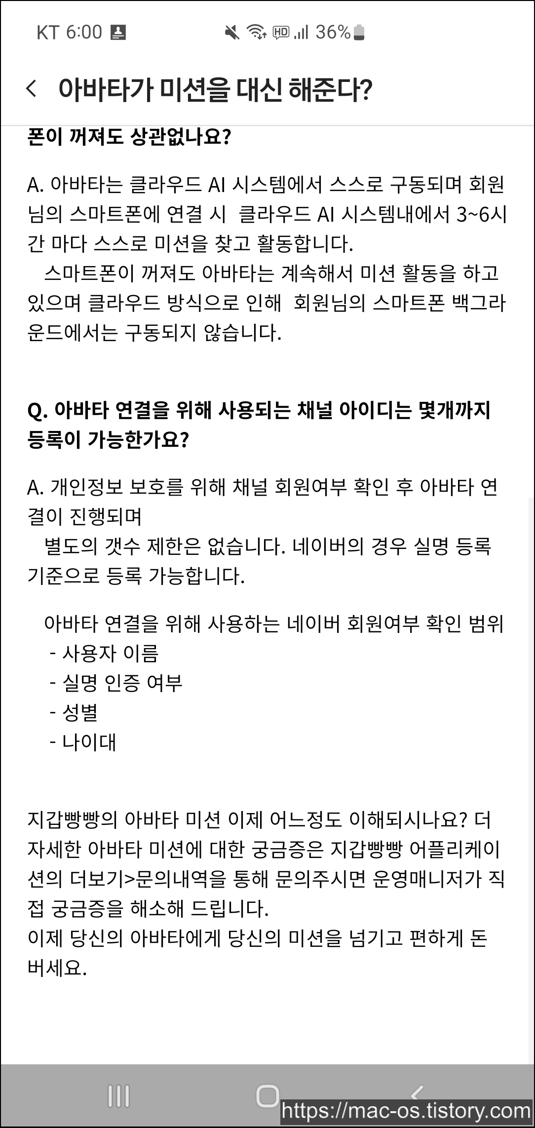 여기서 중요한 것은 아바타는 클라우드 AI 시스템에서 스스로 구동되며 스마트폰에 연결 시 클라우드 AI 시스템 내에서 3~6시간 마다 스스로 미션을 찾고 활동하는 것입니다. 스마트폰이 꺼져도 아바타는 계속해서 미션 활동을 하고 있으며, 클라우드 방식으로 인해 스마트폰 백그라운드에서는 구동되지 않습니다.