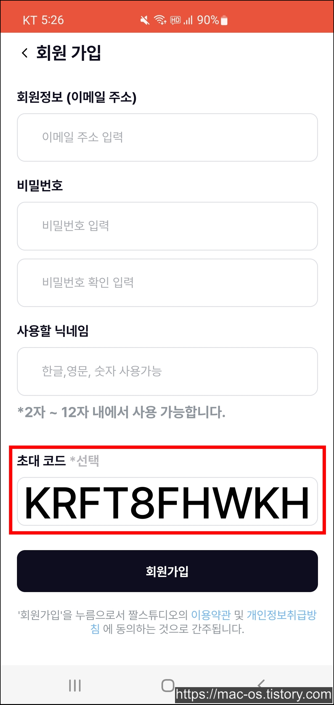 - 짤스튜디오 회원가입 페이지에서 초대코드 입력하기