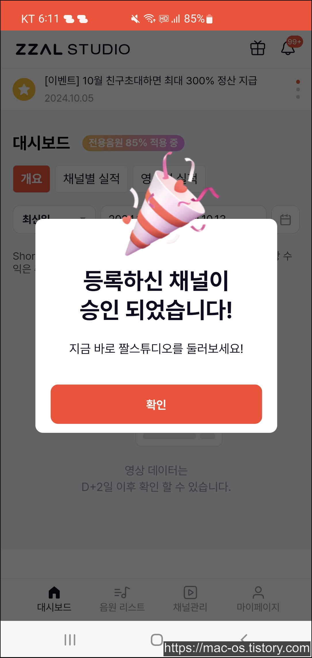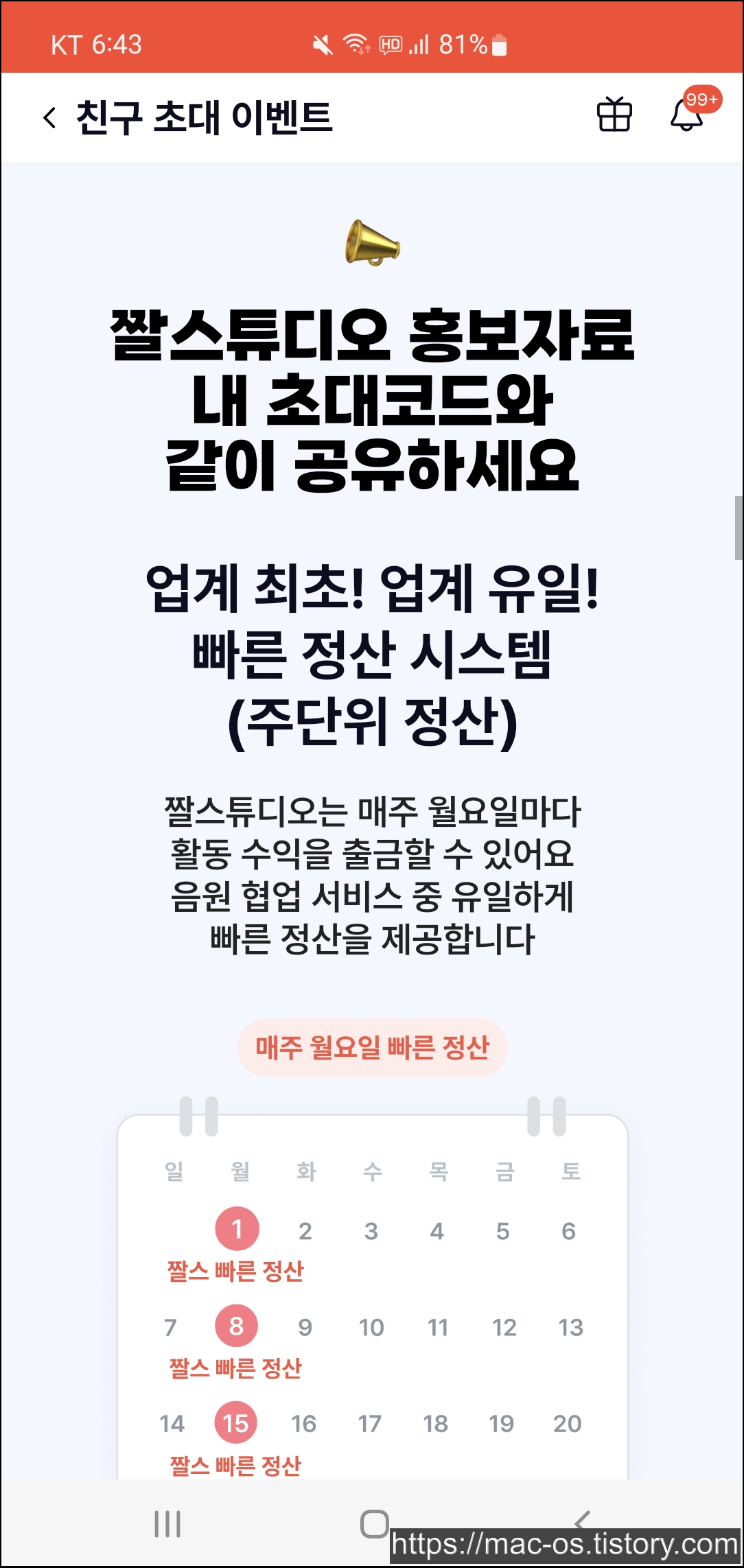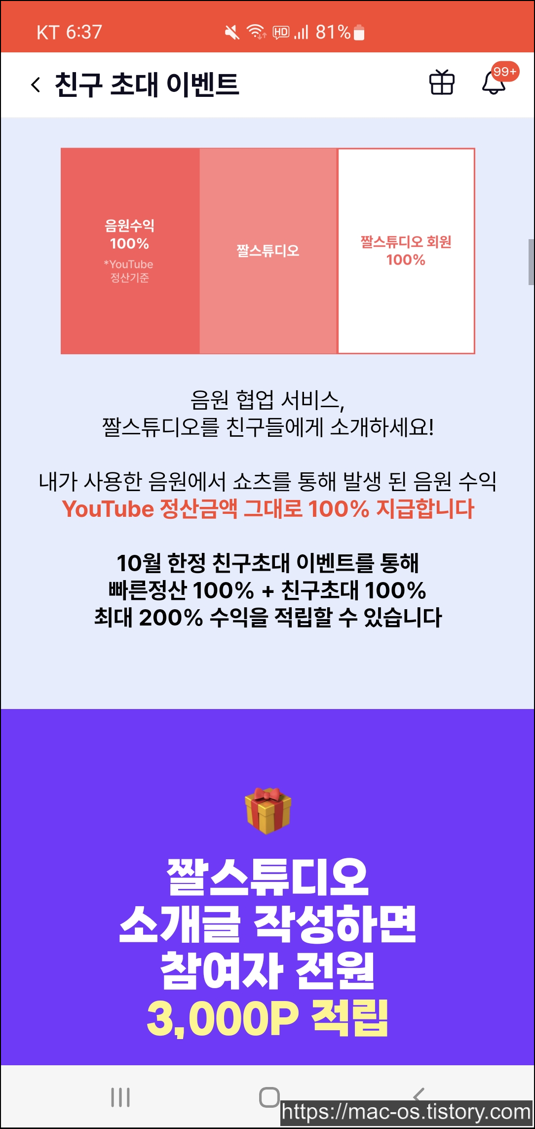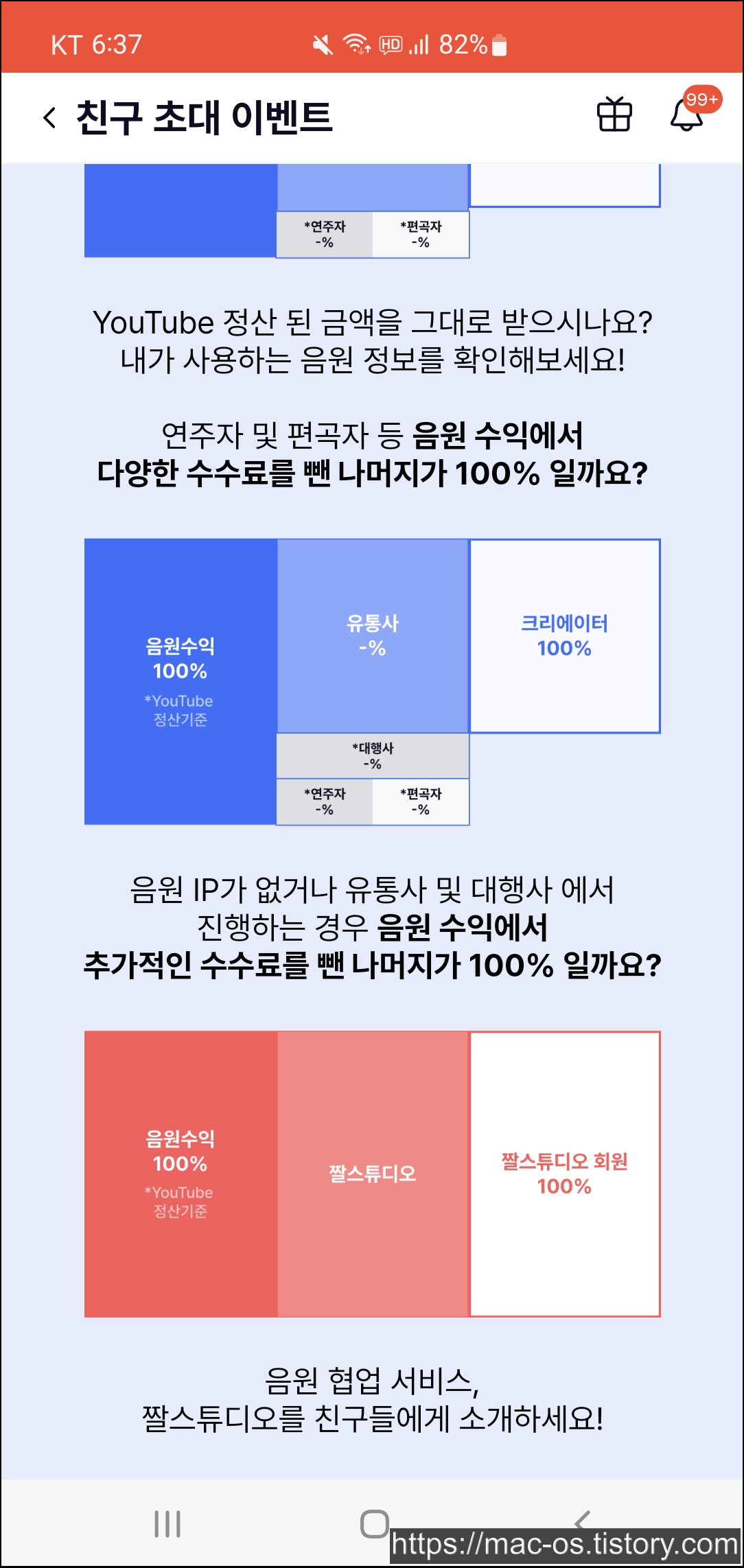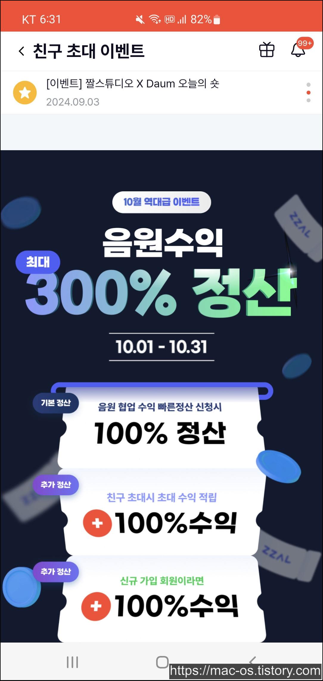짤스튜디오는 현재 친구초대 이벤트를 진행하고 있는데요. 음원수익 300% 정산에서 음원 협업 수익 빠른정산 신청 시 100% 정산, 친구 초대시 초대 수익 적립 100% 수익, 신규 가입 회원이라면 100% 수익을 받을 수 있습니다.
