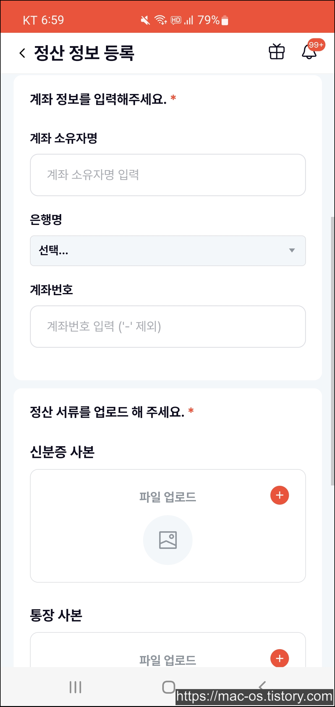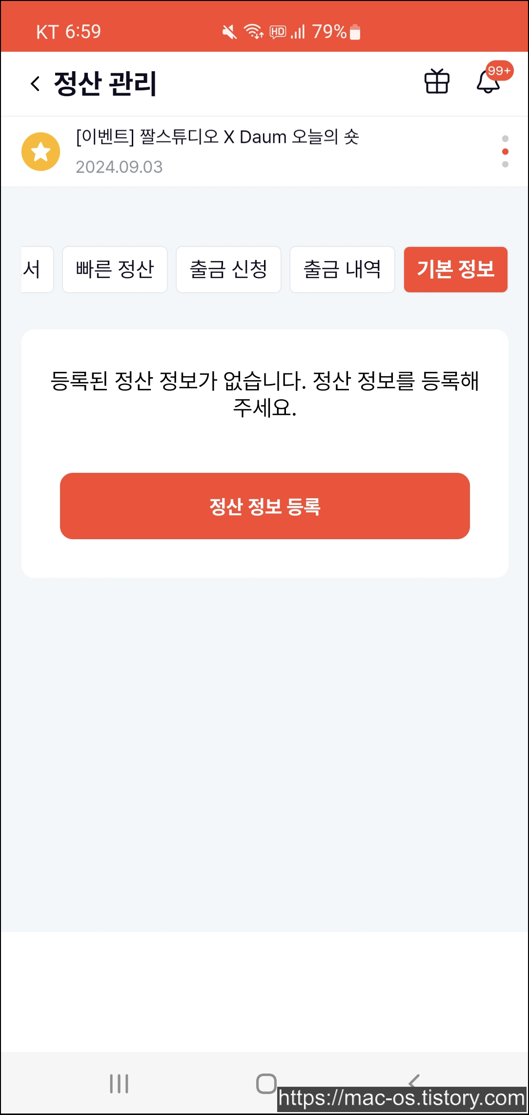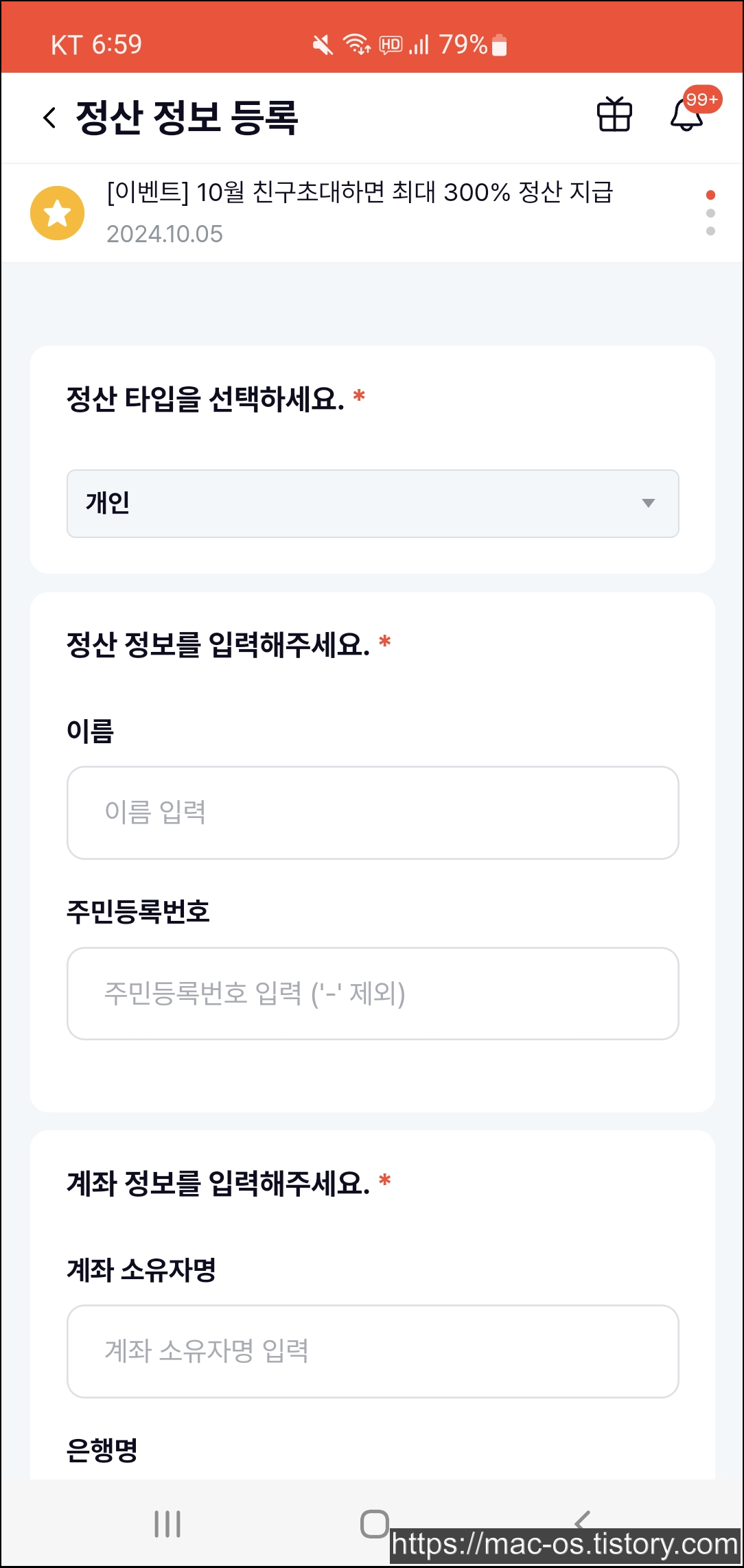 정산 관리 페이지에서 정산 정보를 등록합니다. 정산 타입, 이름, 주민등록번호, 계좌 소유자명, 은행명 등을 입력합니다.