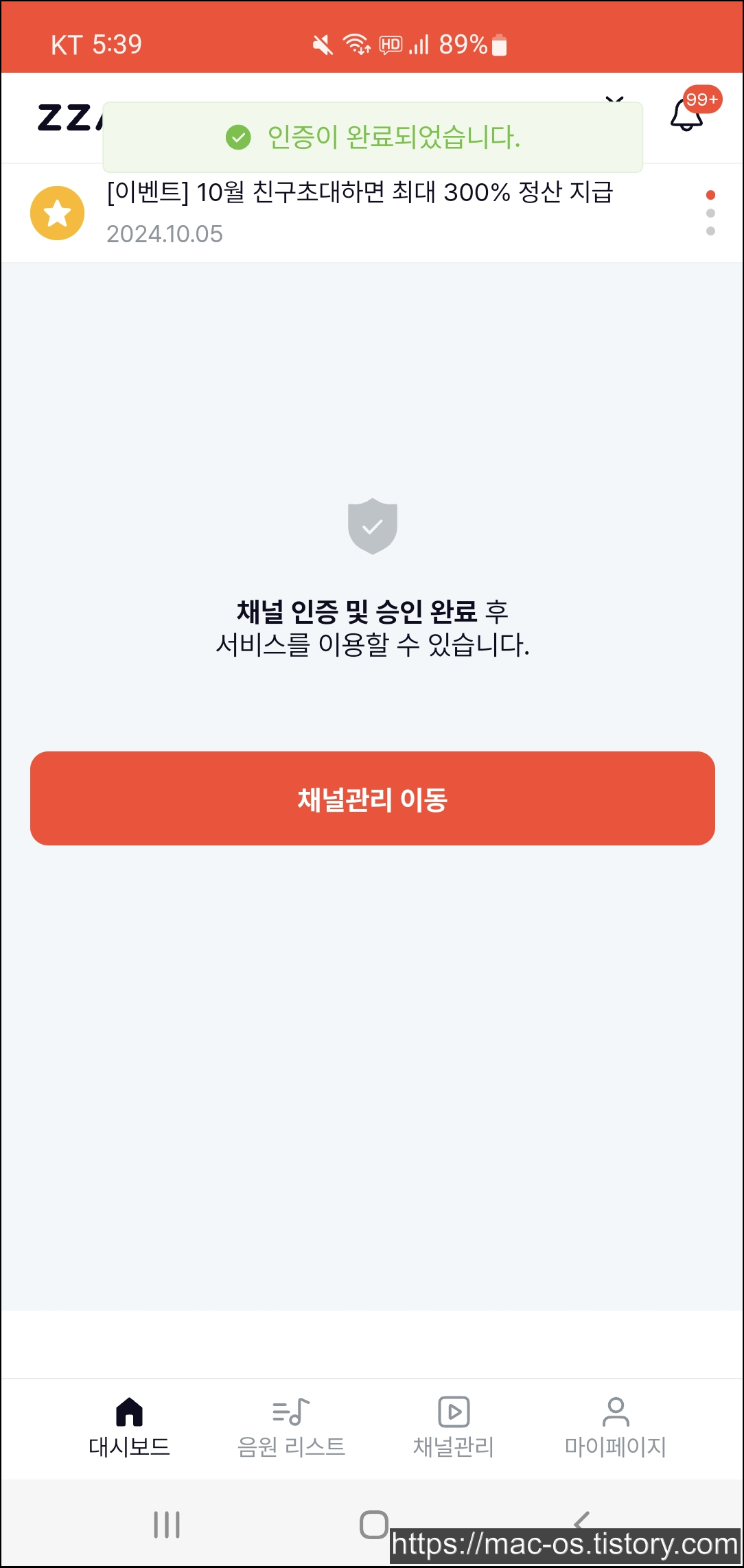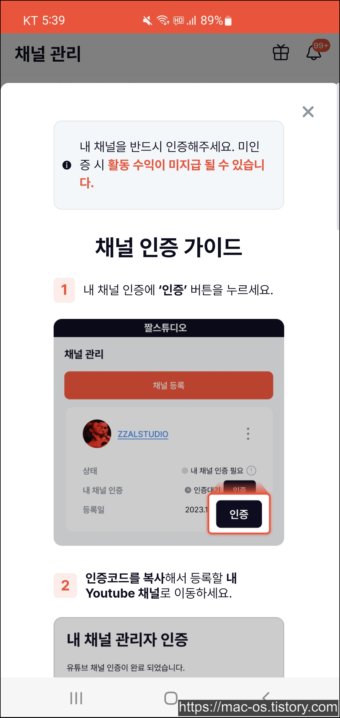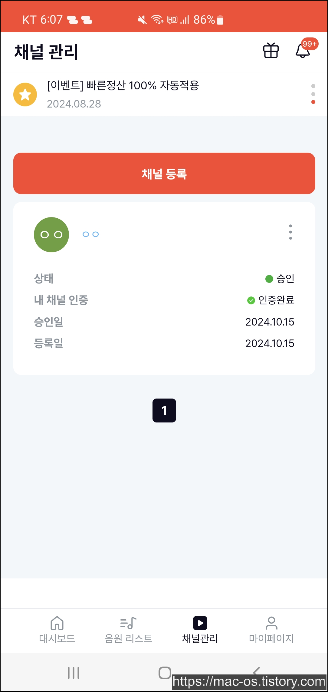 채널을 등록하면 상태가 승인으로 바뀌고 내 채널 인증에서 인증완료로 표시됩니다.