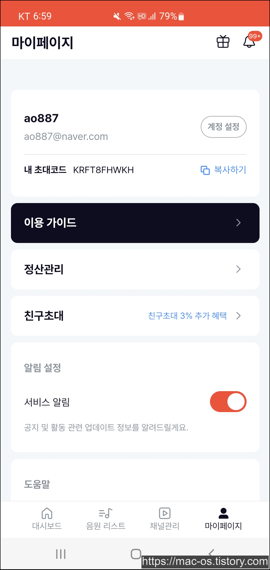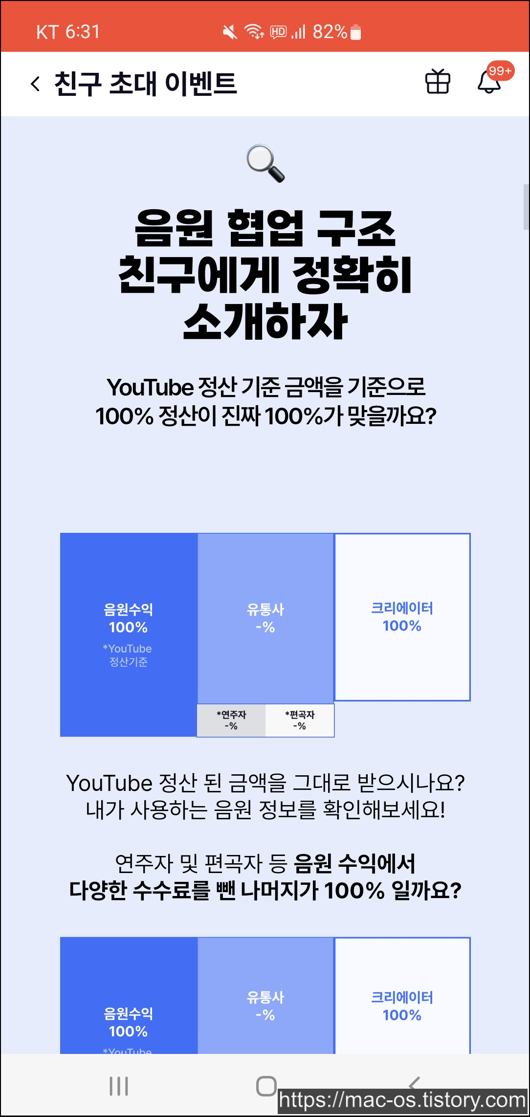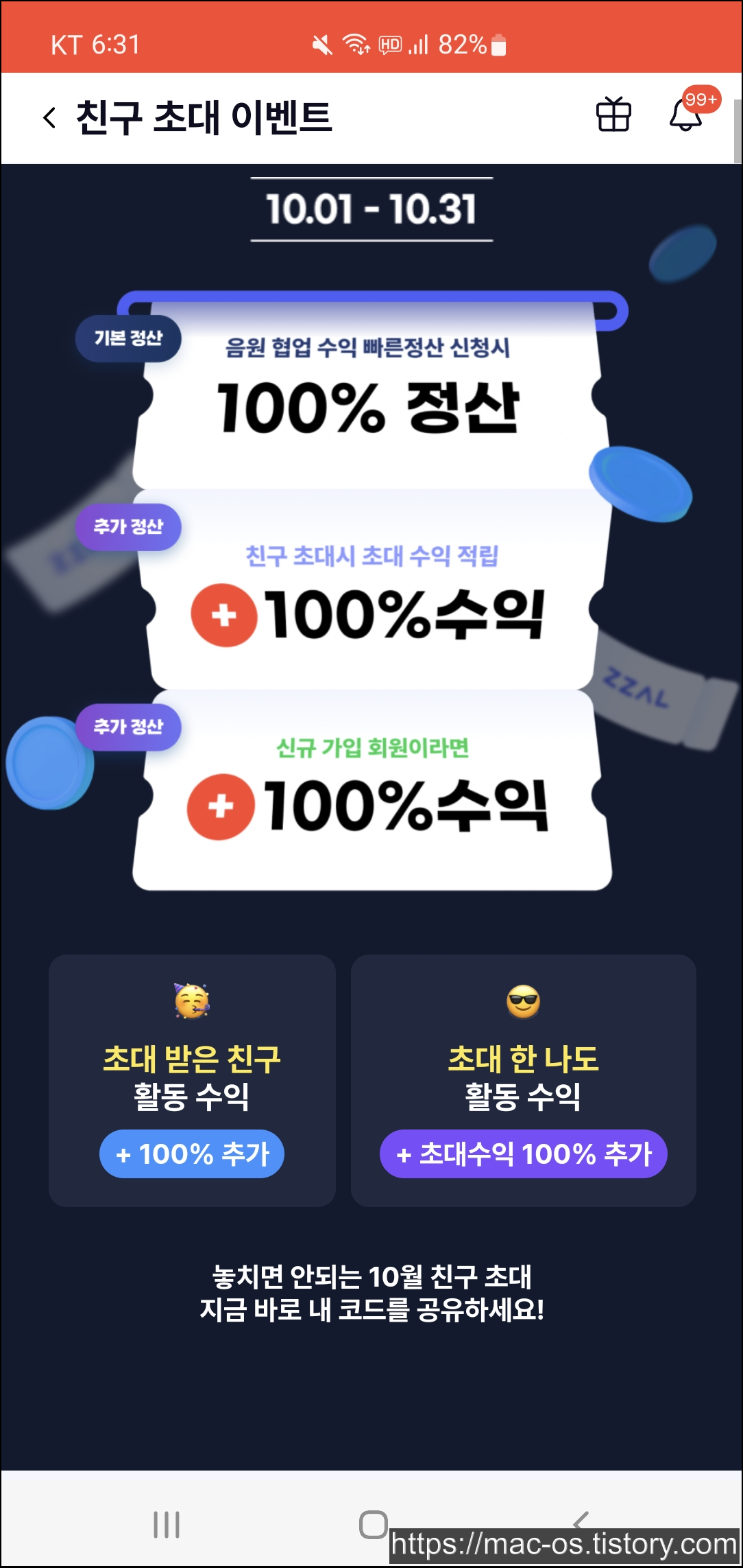 친구를 초대한 사람만 혜택을 받는 것이 아니라, 친구에게 초대받아 다른 사람의 초대코드를 입력하고 가입한 신규 회원에게도 혜택이 주어집니다. 만약 내가 초대코드를 입력하고 가입한 다음 음원수익을 통해 10만원을 얻었다면 초대코드 입력 보상으로 10만원을 더 받게 되는 식입니다.