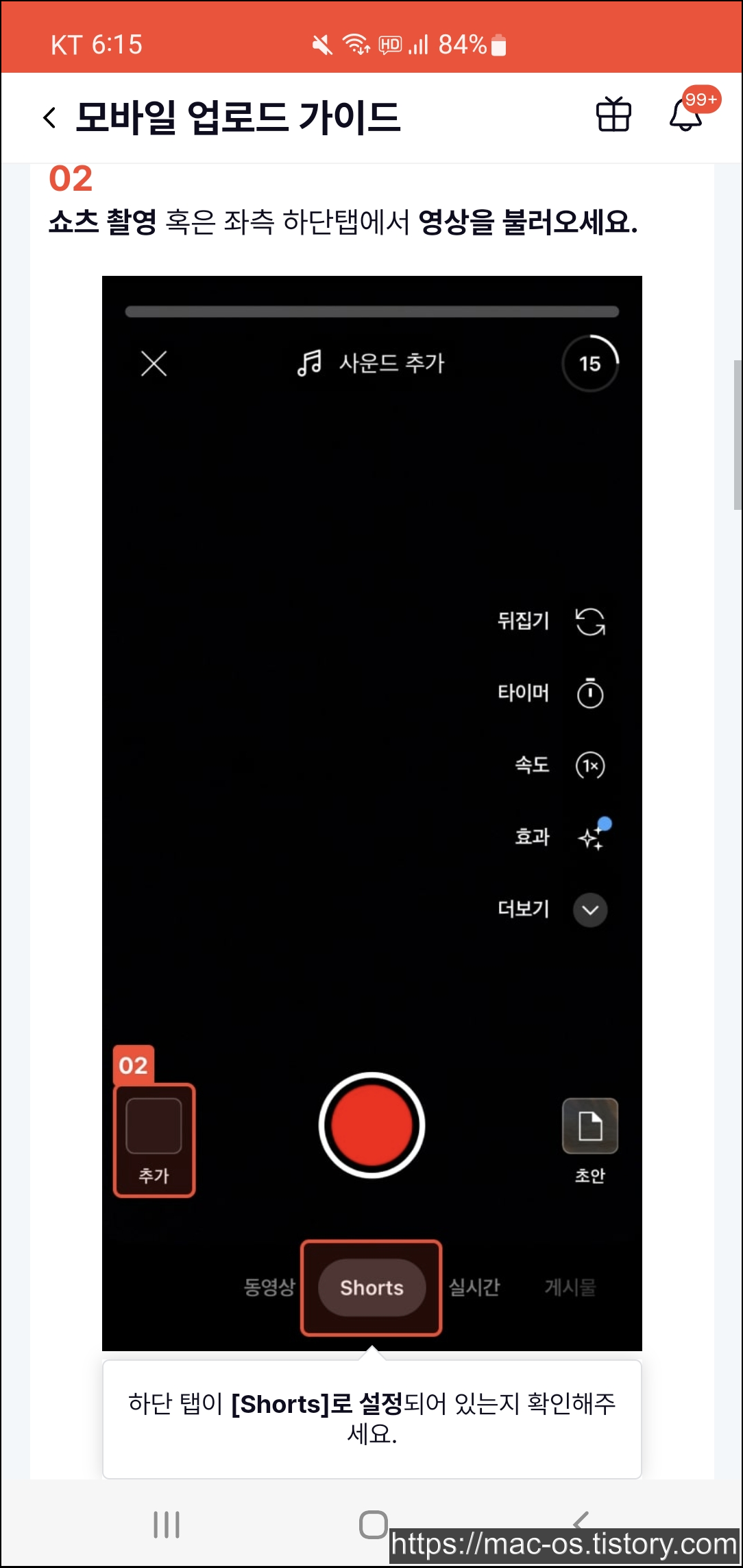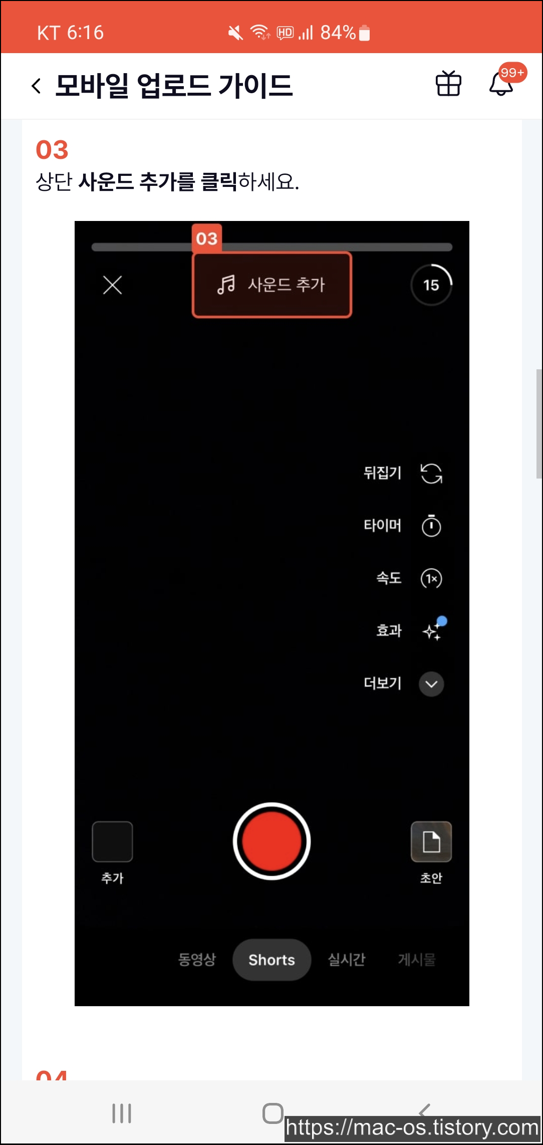 유튜브 앱 하단의 +버튼을 누르고 쇼츠 촬영 혹은 좌측 하단 탭에서 영상을 불러옵니다. 그리고 상단 사운드 추가를 클릭합니다.