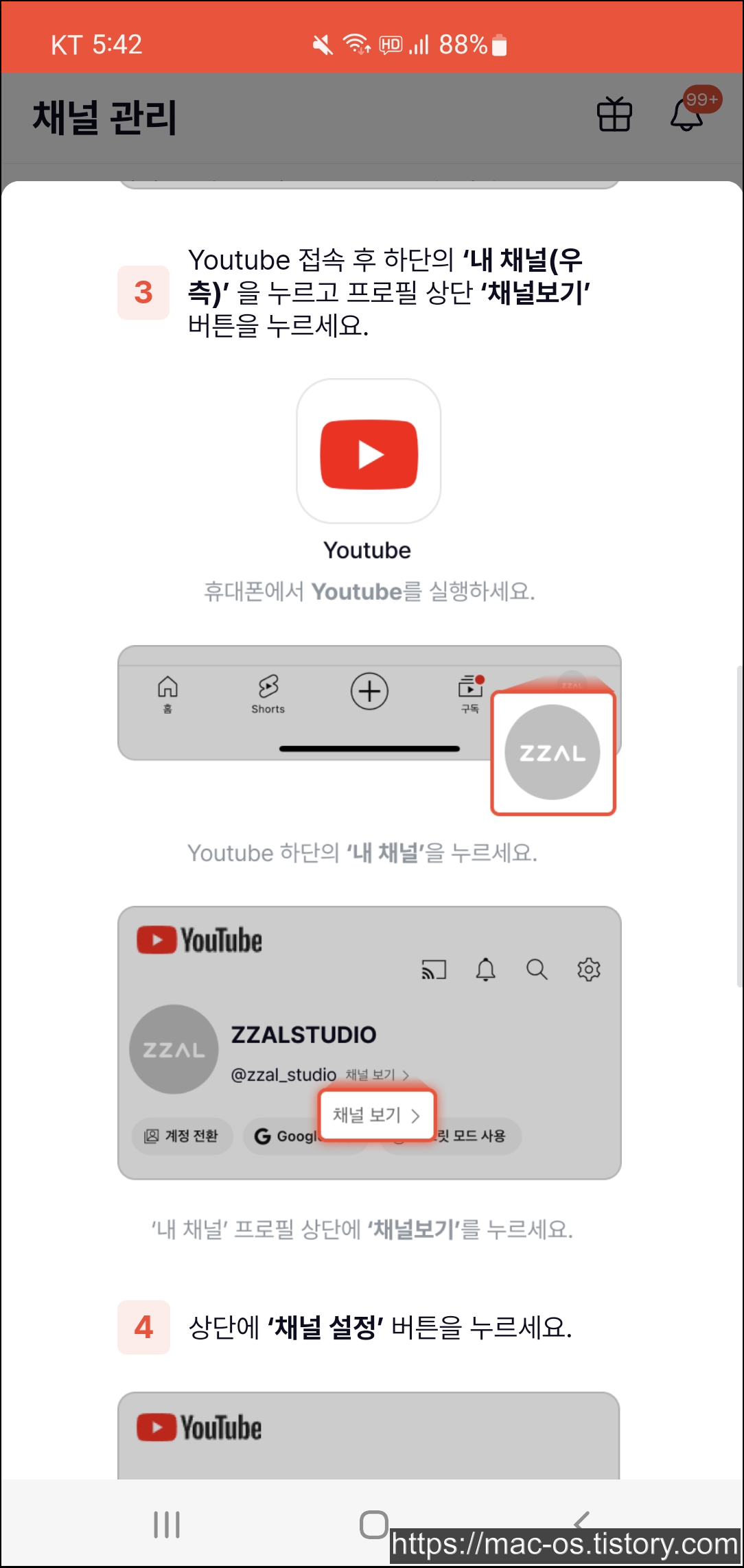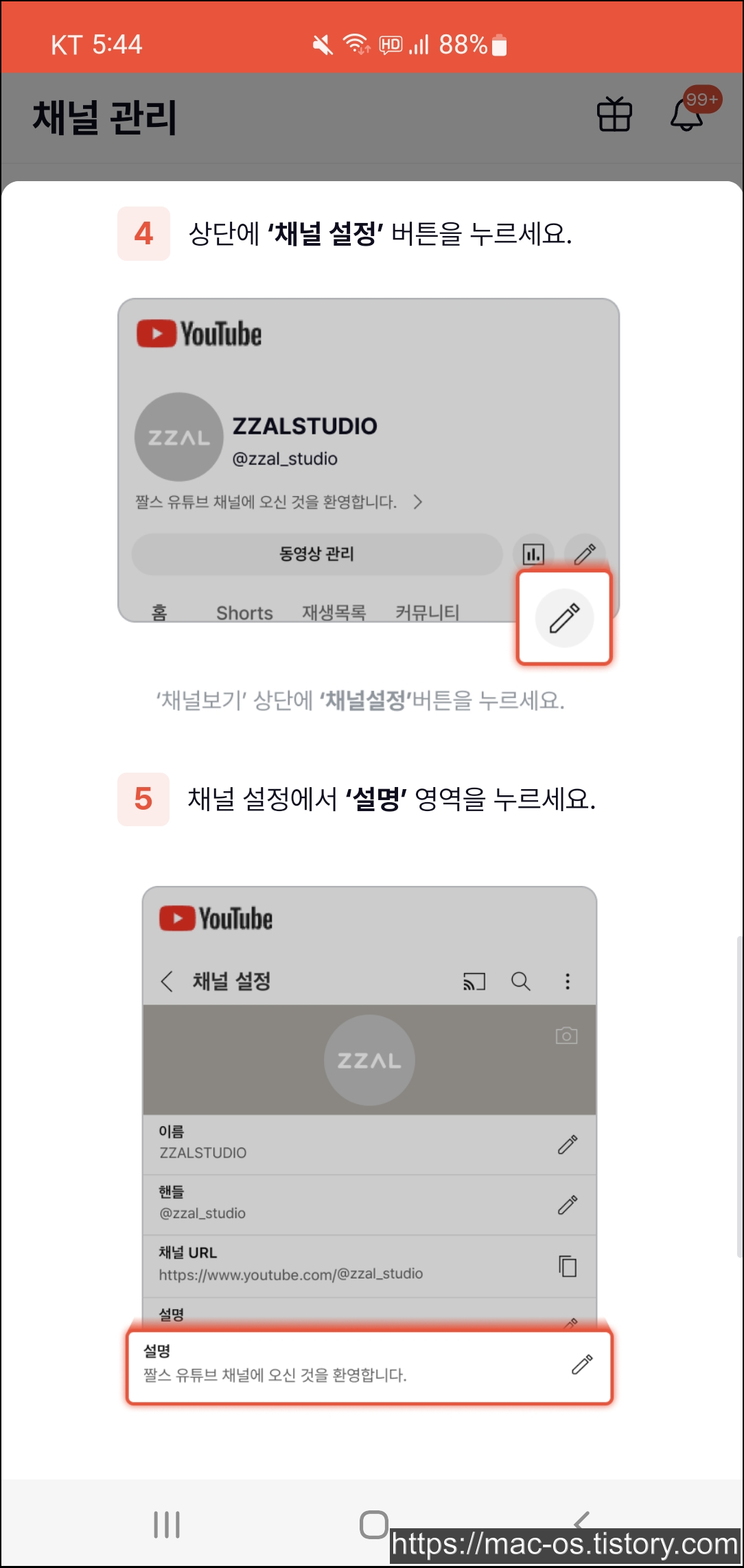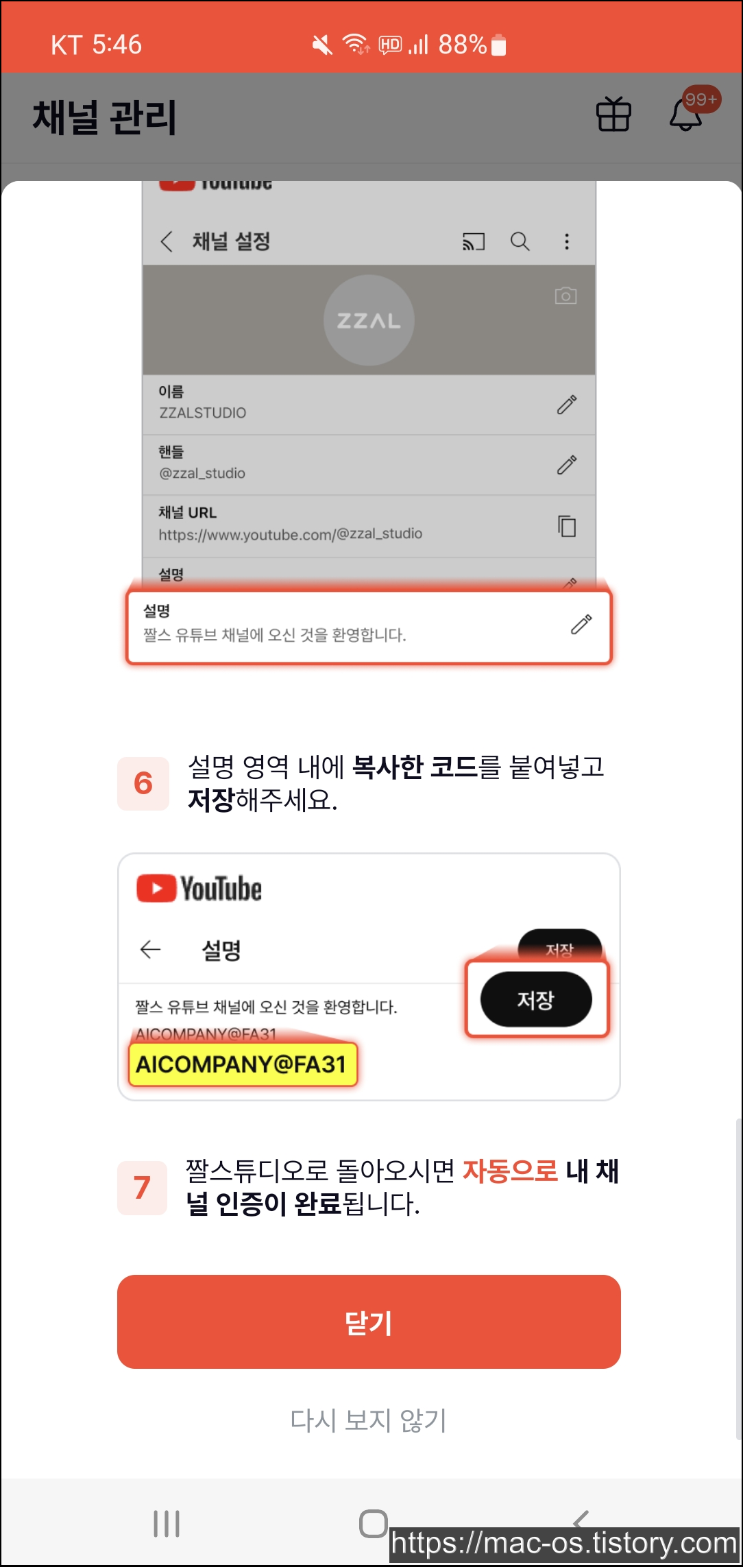 상단에 채널 설정 버튼을 누르고 채널 설정에서 설명 영역을 터치합니다. 설명 영역 내에 복사한 코드를 붙여넣고 저장합니다. 짤스튜디오로 돌아오면 자동으로 내 채널 인증이 완료됩니다.