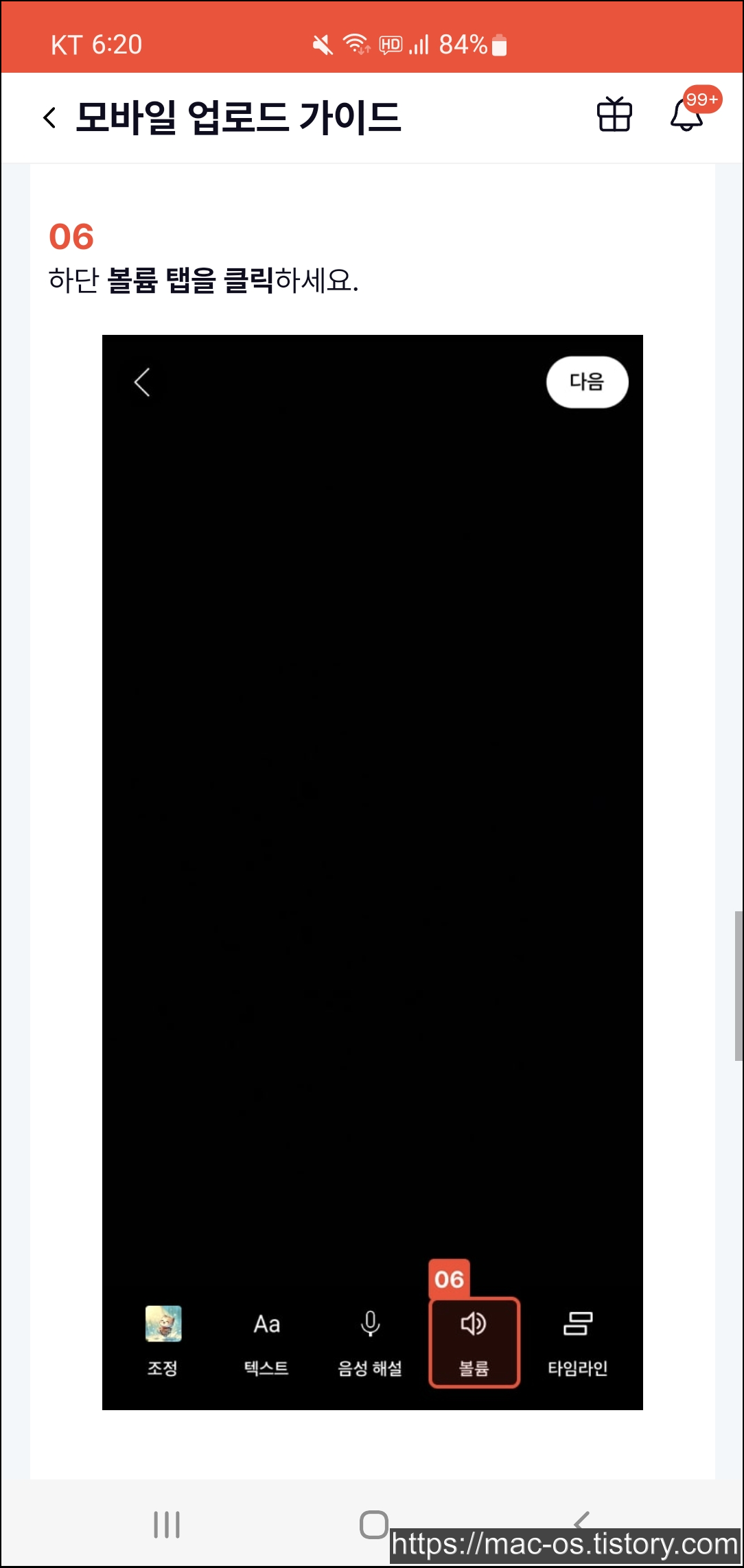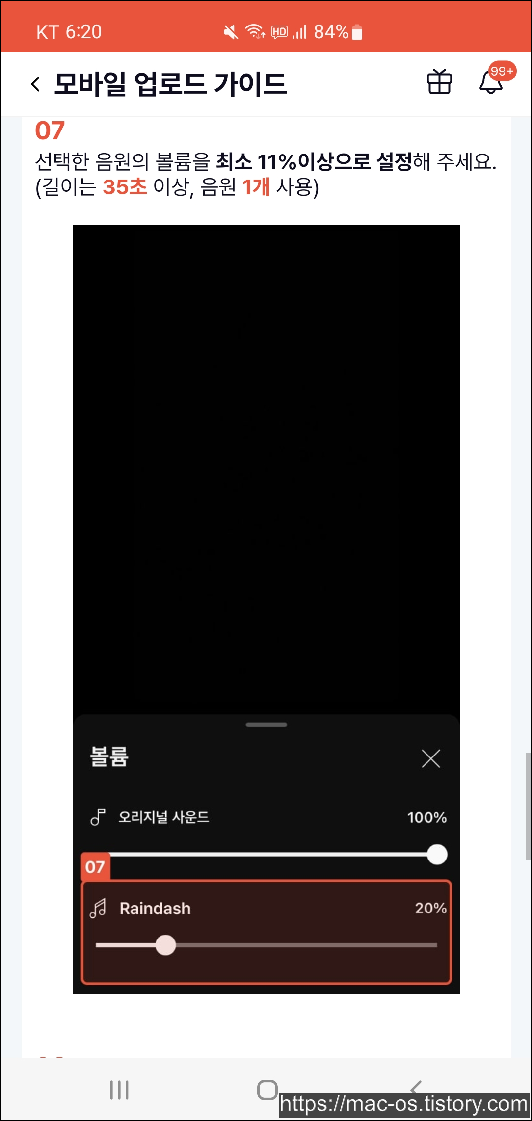하단 볼륨 탭을 클릭하고, 선택한 음원의 볼륨을 최소 11% 이상으로 설정합니다. 길이는 35초 이상으로 하고 음원은 1개 사용하면 됩니다.