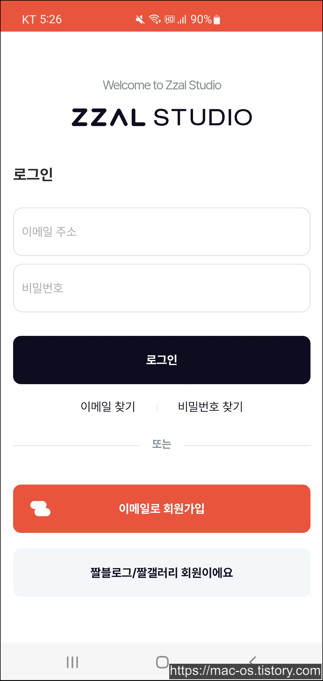 구글 플레이 스토어에서 짤스튜디오 앱을 설치하고 실행합니다. 그리고 로그인 페이지에서 이메일로 회원가입을 터치합니다.