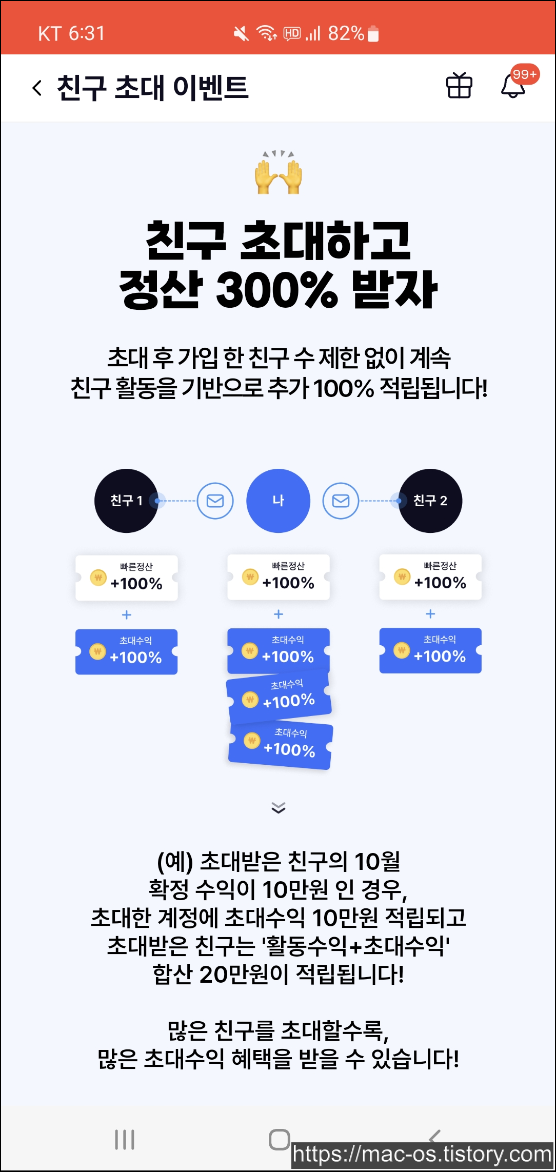 - 초대받은 친구가 10만원을 벌면 초대수익으로 10만원을 더 받아서 총 20만원을 받을 수 있음