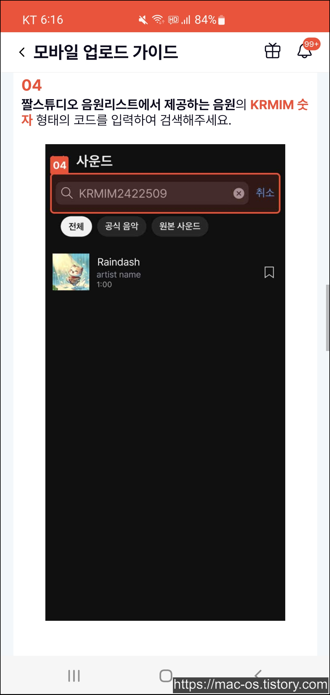 짤스튜디오 음원리스트에서 제공하는 음원의 KRMIN 숫자 형태의 코드를 입력하여 검색합니다. 그리고 우측 하단에 체크 버튼을 클릭합니다.