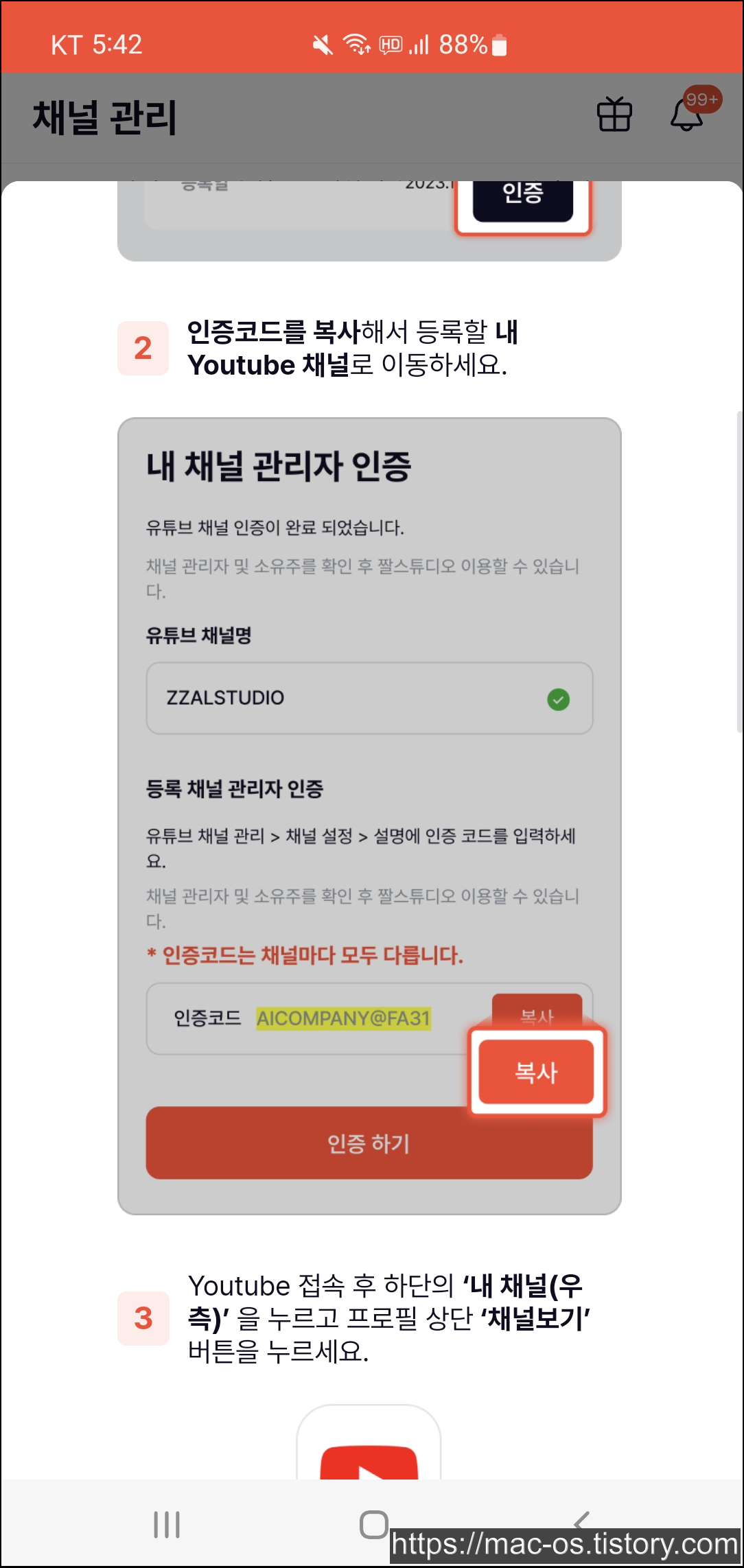 짤스튜디오 회원가입을 마쳤으면 유튜브 채널 인증 및 승인 완료 후 서비스를 이용할 수 있습니다. 그럼 채널 인증 가이드를 통해 채널 인증 방법을 살펴보겠습니다. 우선, 내 채널 인증에 인증 버튼을 누르고 인증코드를 복사해서 등록할 내 유튜브 채널로 이동합니다.