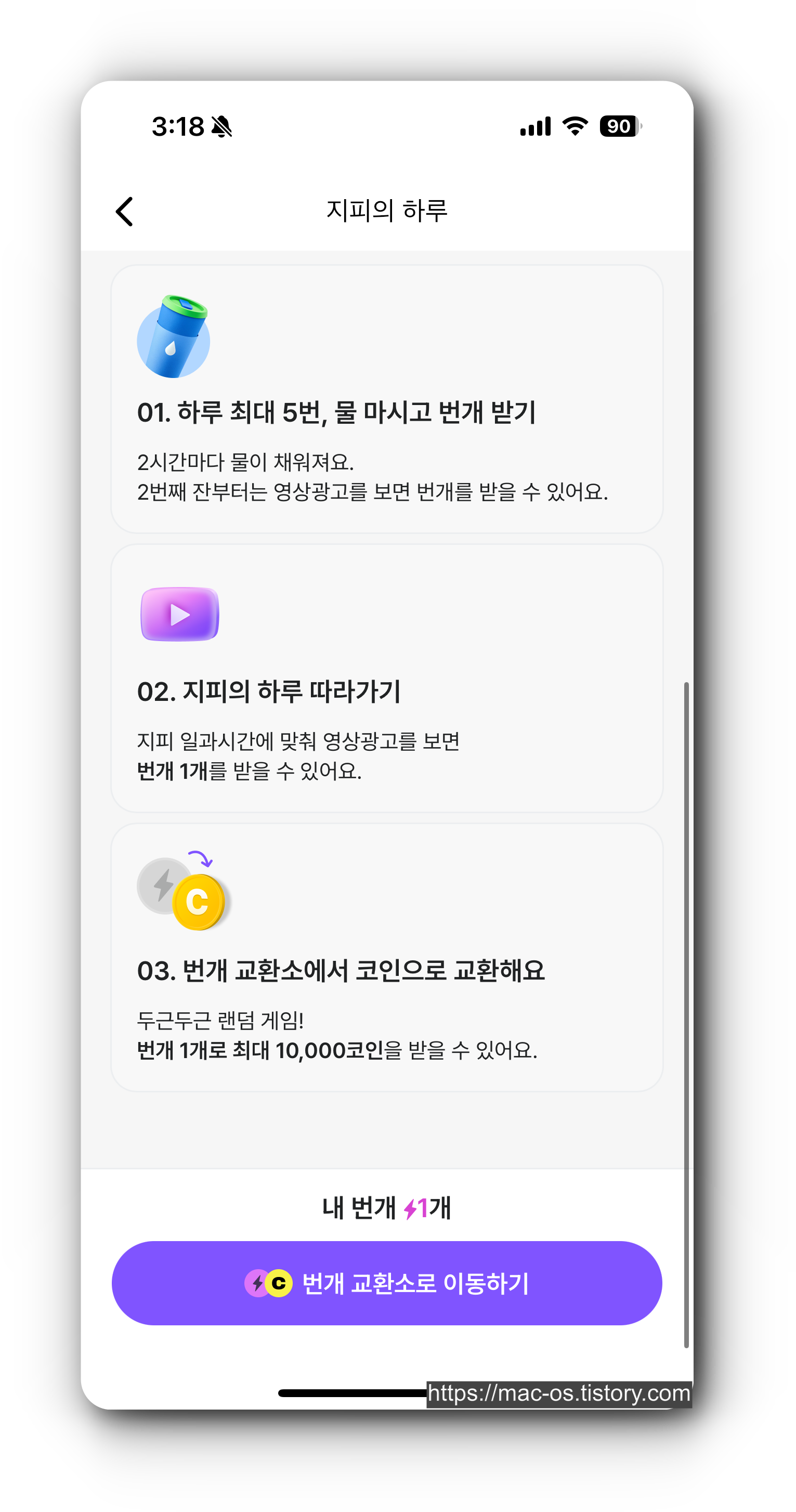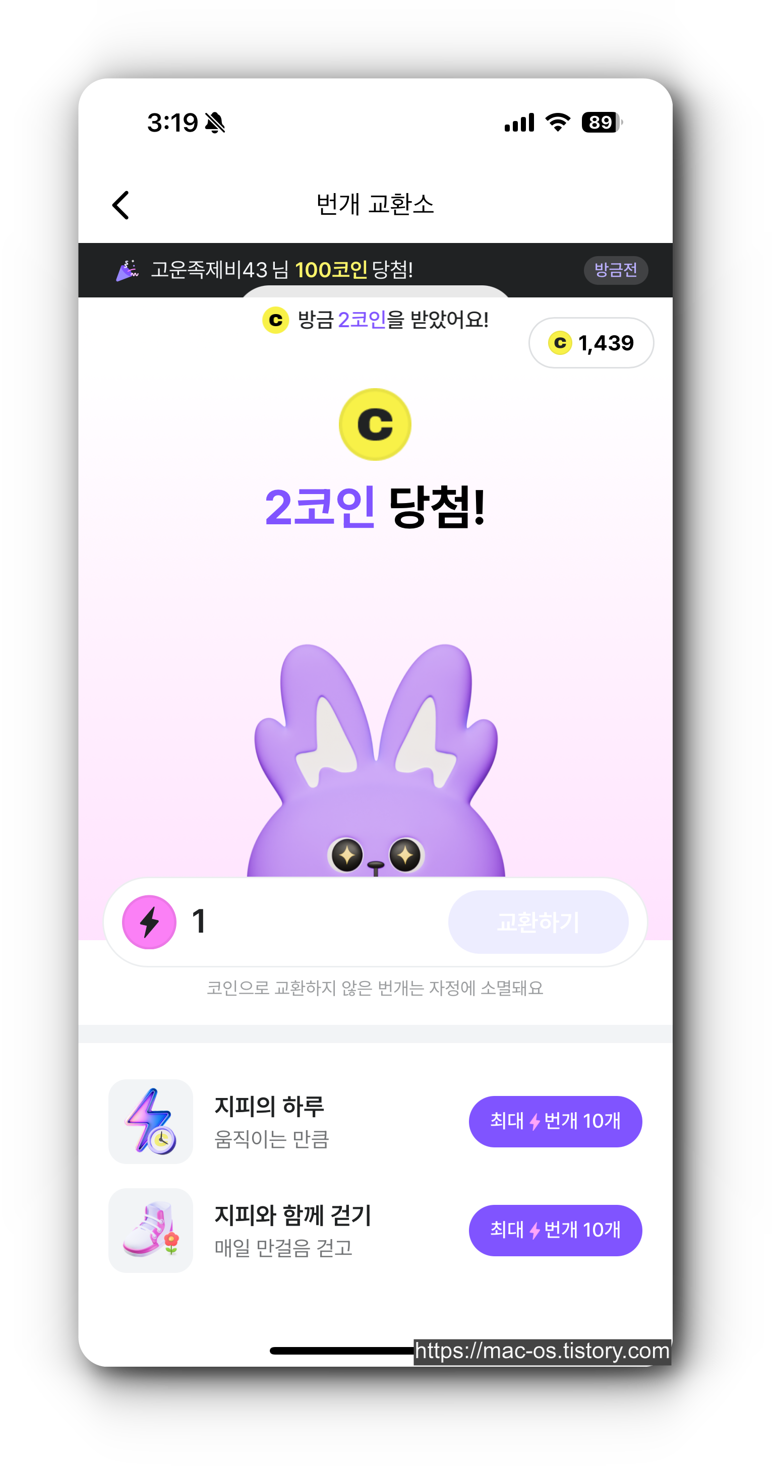 교환하기 버튼을 눌러 번개 1개를 소모하여 코인 적립