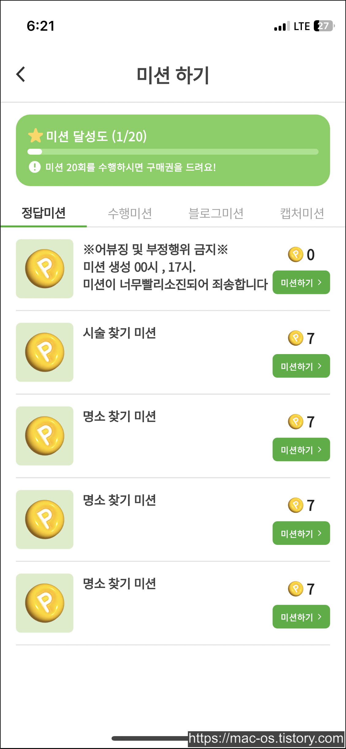 우측 상단에 미션하기를 누르면 정답 미션, 수행미션, 블로그 미션, 캡처미션을 할 수 있는데요. 미션 20개를 달성하면 구매권을 받을 수 있고, 각 미션을 달성해도 포인트를 줍니다.