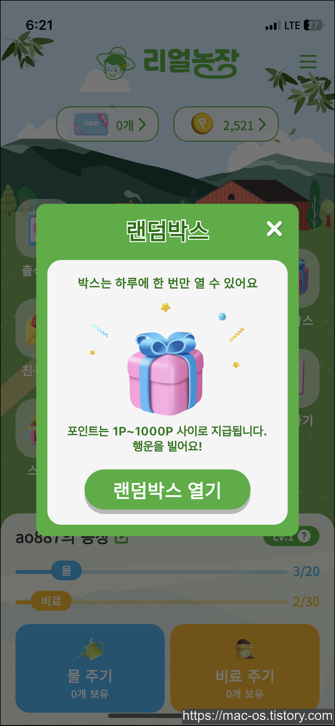 리얼농장 회원가입을 마치고, 좌측 상단에 있는 출석체크를 누르면 출석이 완료되면서 구매권 1개를 줍니다. 구매권은 물이나 비료를 구매하는데 사용되는데요