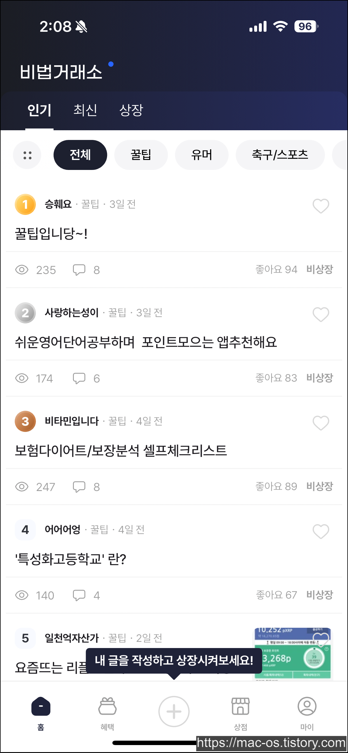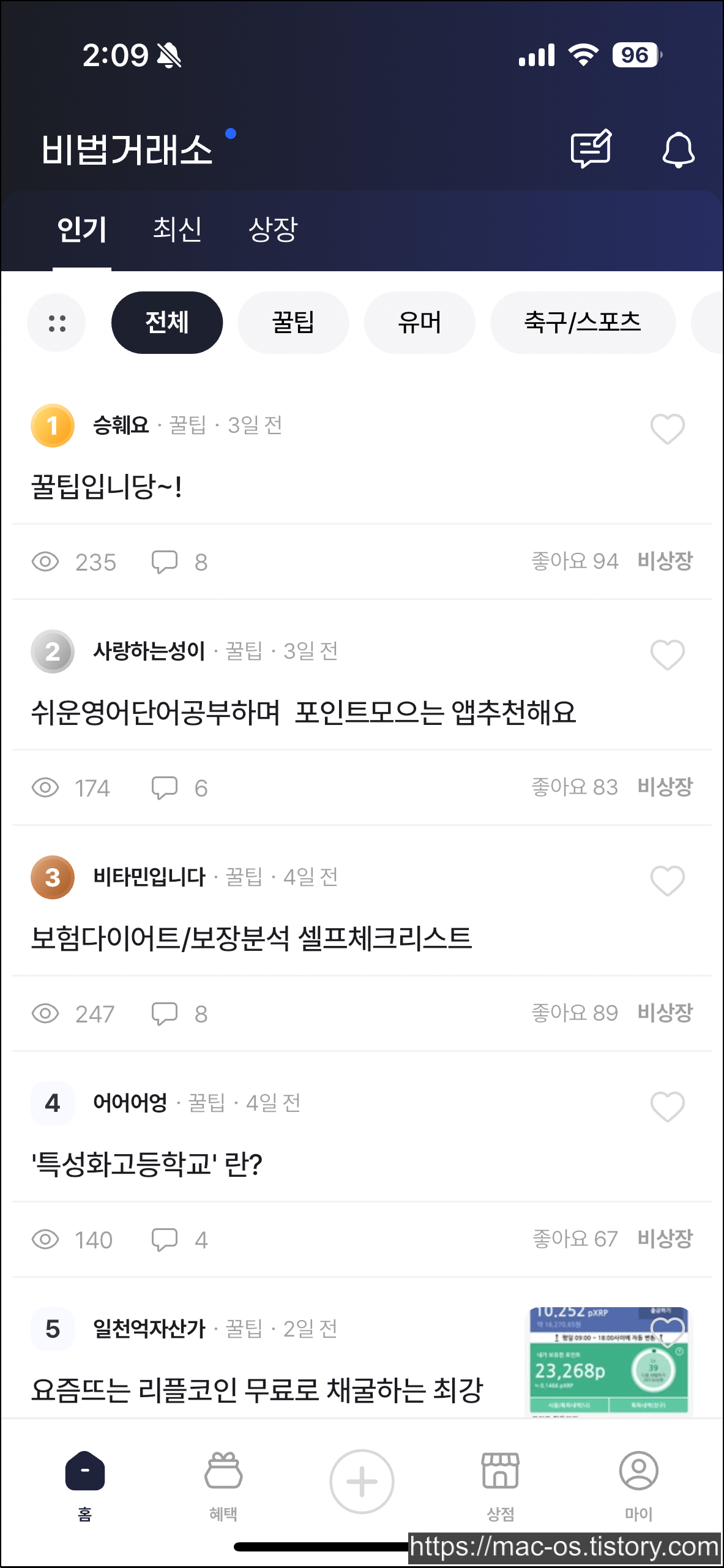 홈으로 이동하면 글이 여러개 있는데, 여기서 글을 눌러서 좋아요를 누르면 됩니다. 비법글에 좋아요 3개를 누르면 20원을 받을 수 있습니다.