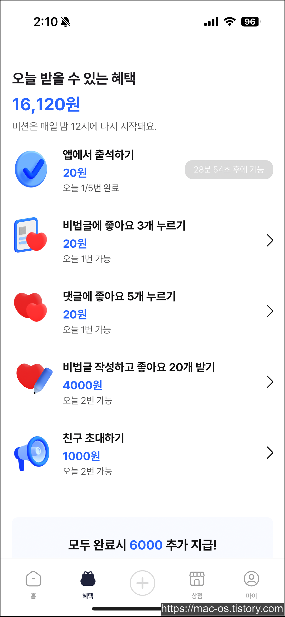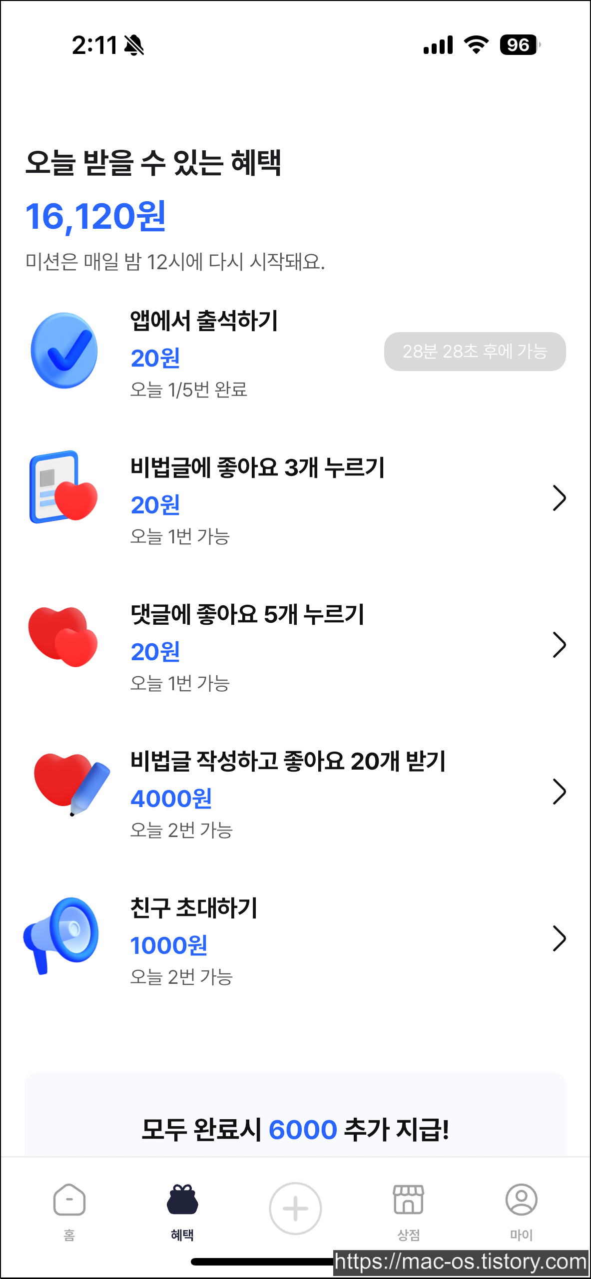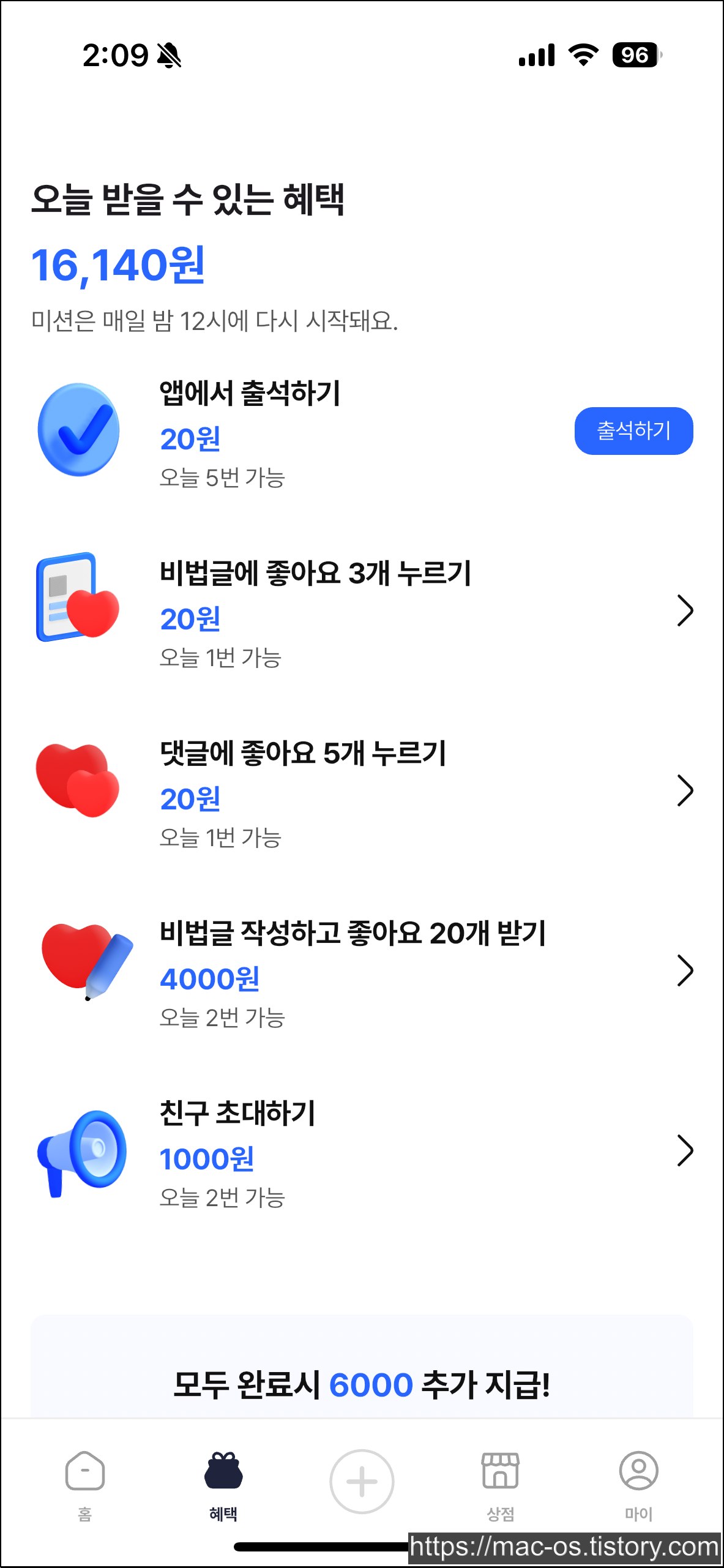 - 출석체크, 좋아요 누르기 등과 같은 간단한 미션을 통해 하루 5분만에 140원 적립 가능