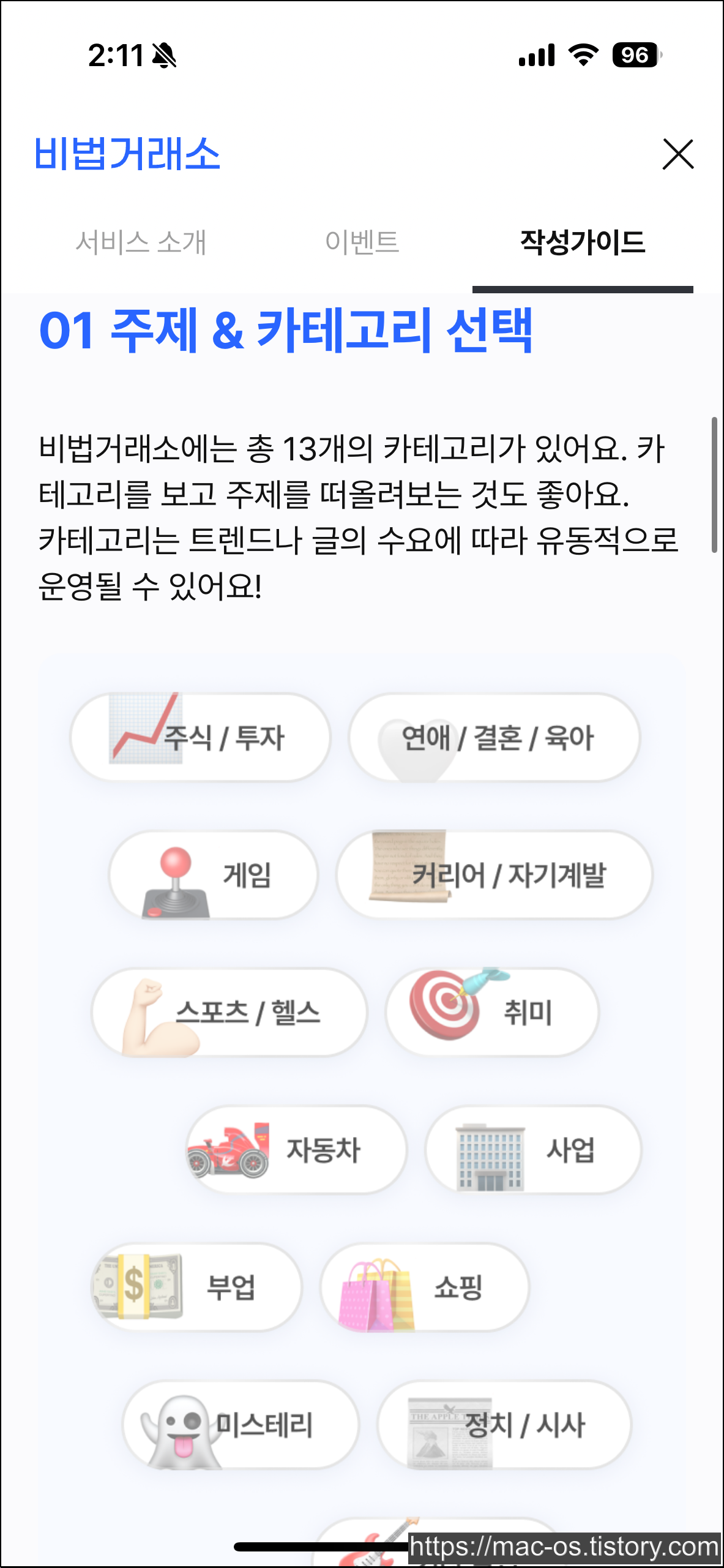 비법거래소 작성가이드를 살펴보면, 비법거래소에는 총 13개의 카테고리가 있습니다. 카테고리는 트렌드나 글의 수요에 따라 유동적으로 운영하면 좋습니다.