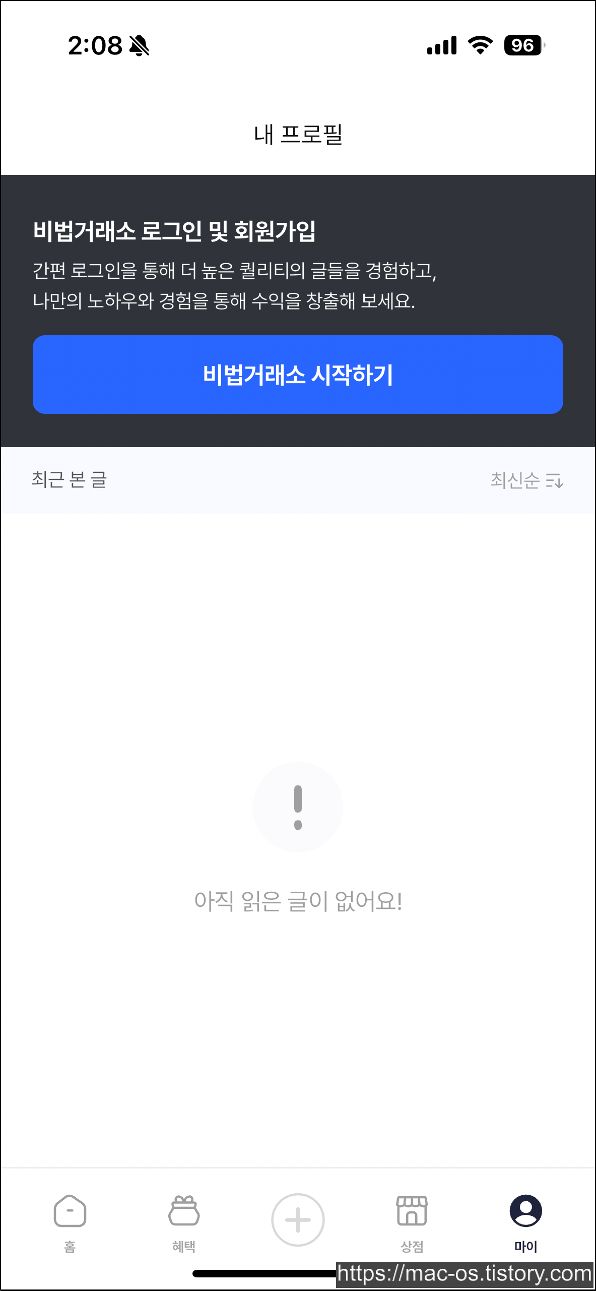 처음 앱을 실행하면 왼쪽 화면인데요. 내 프로필 페이지로 이동해서 비법거래소 시작하기 버튼을 누릅니다.
