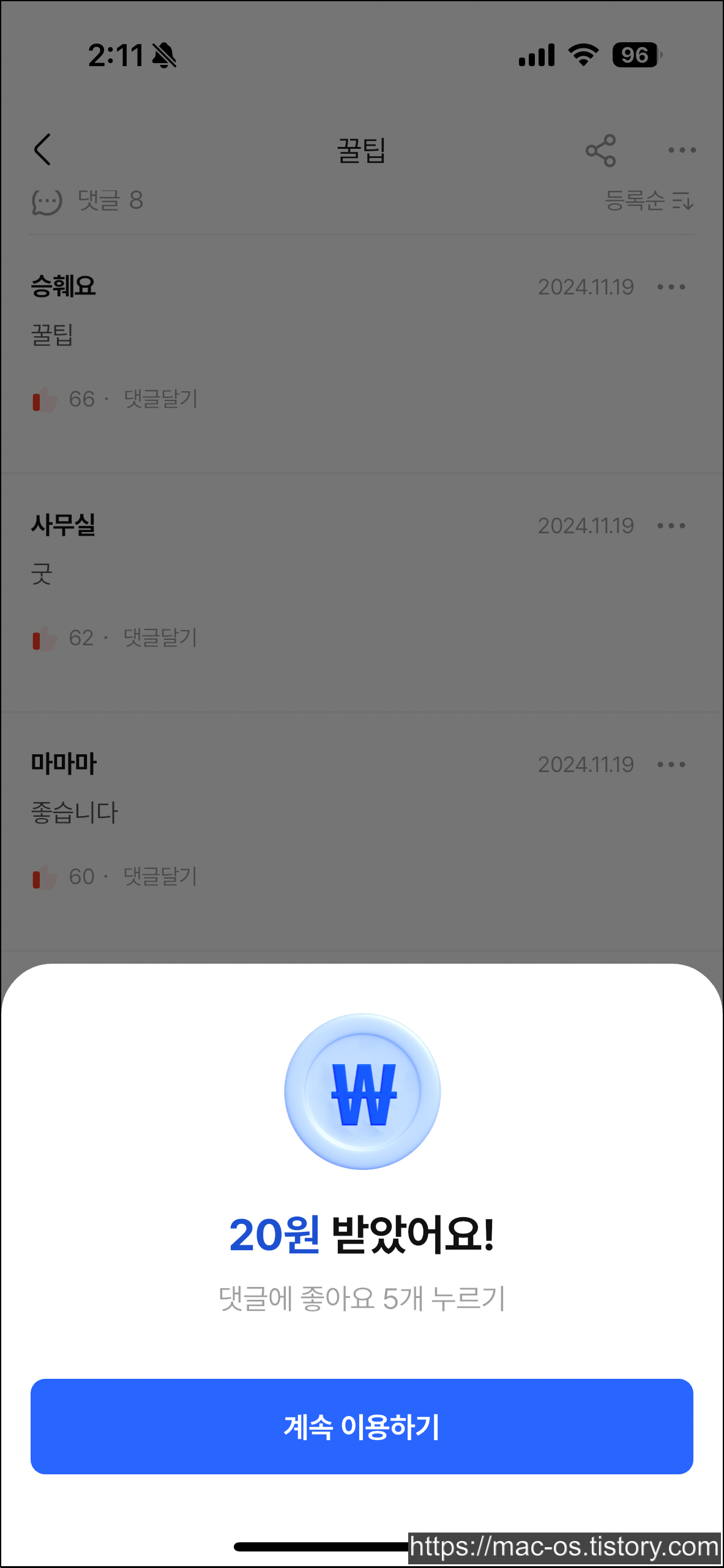 비법글에 좋아요 3개를 누른 것처럼, 댓글에 좋아요 5개를 누르면 20원을 받을 수 있습니다.