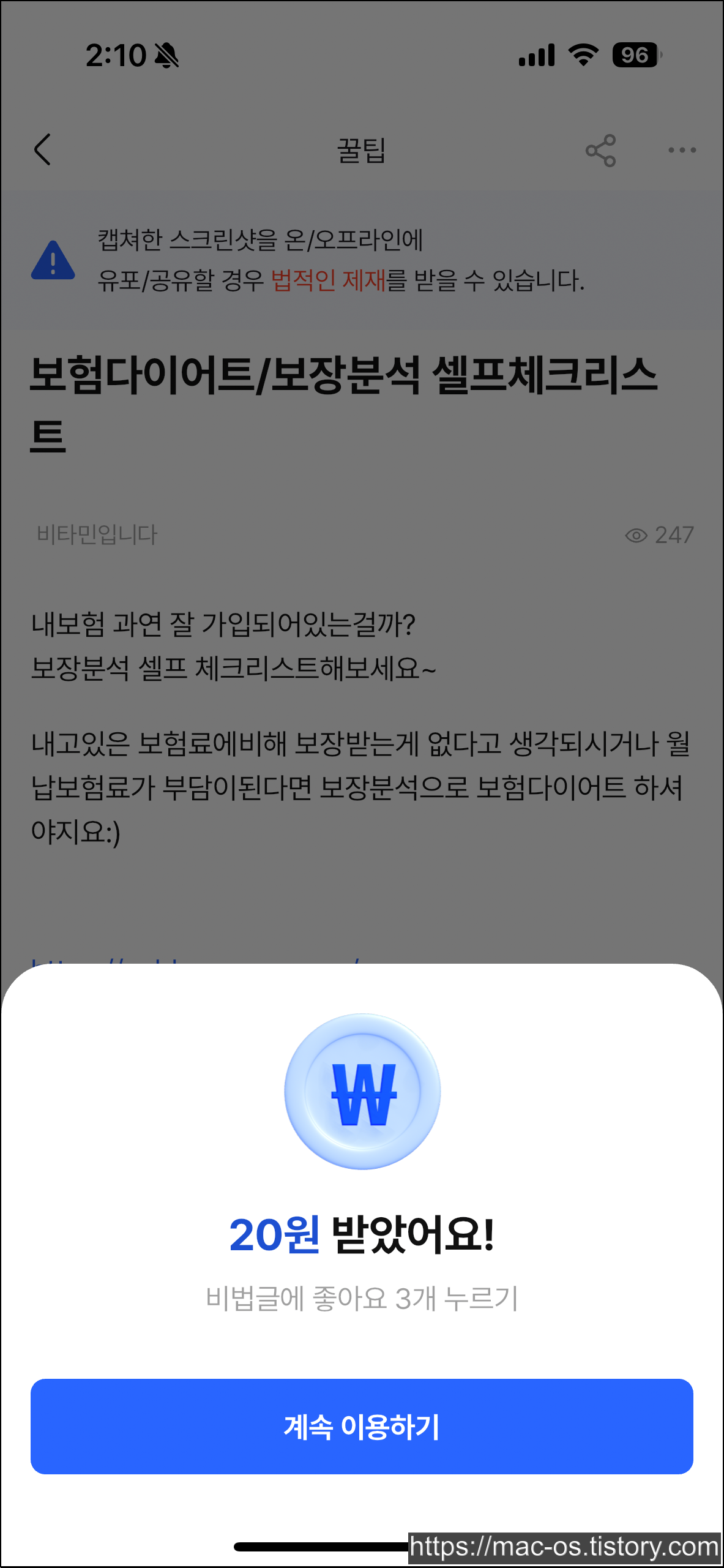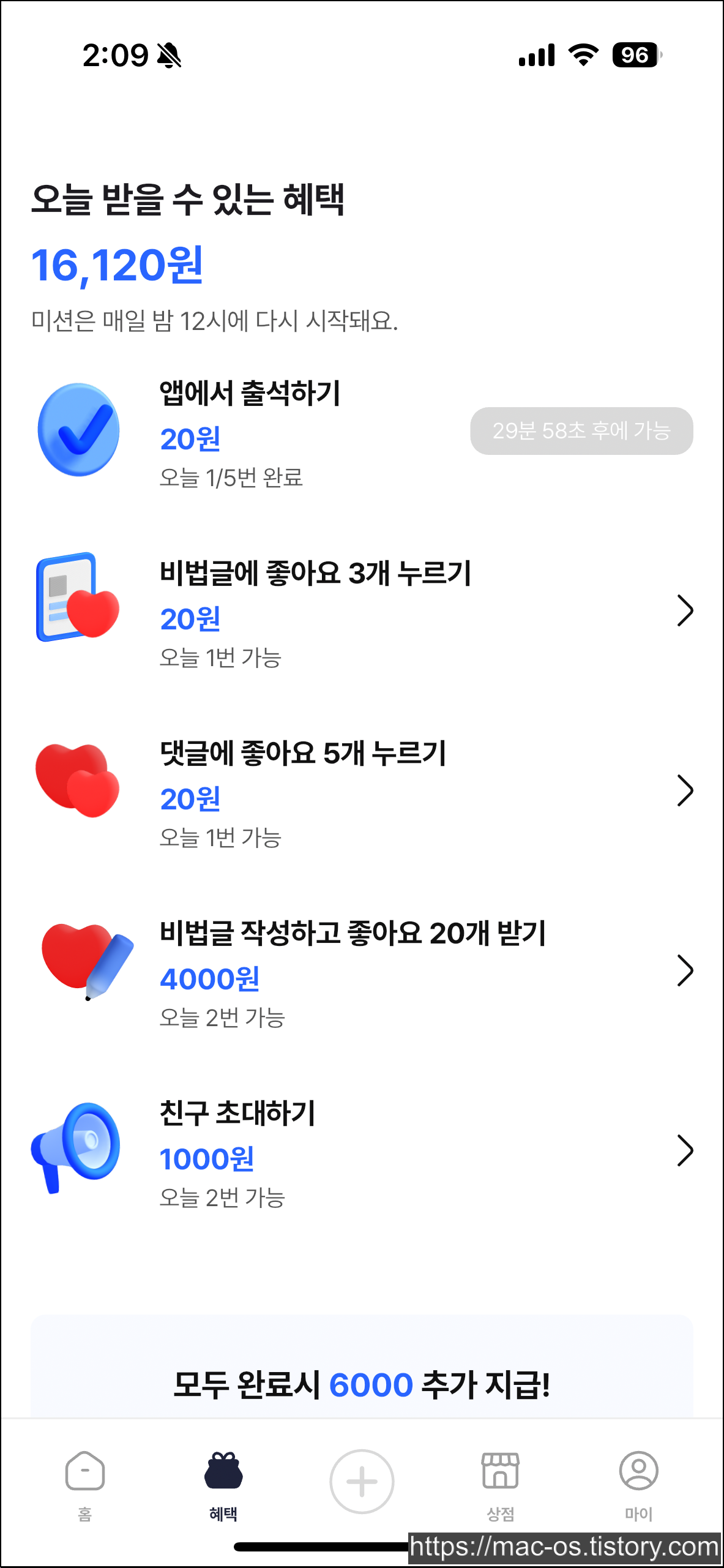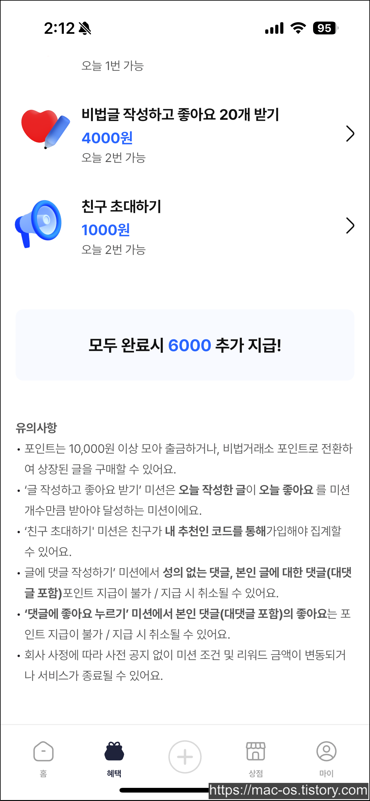 - 비법글을 작성해서 좋아요 20개를 받으면 4000원을 받을 수 있는데, 하루에 2번 가능