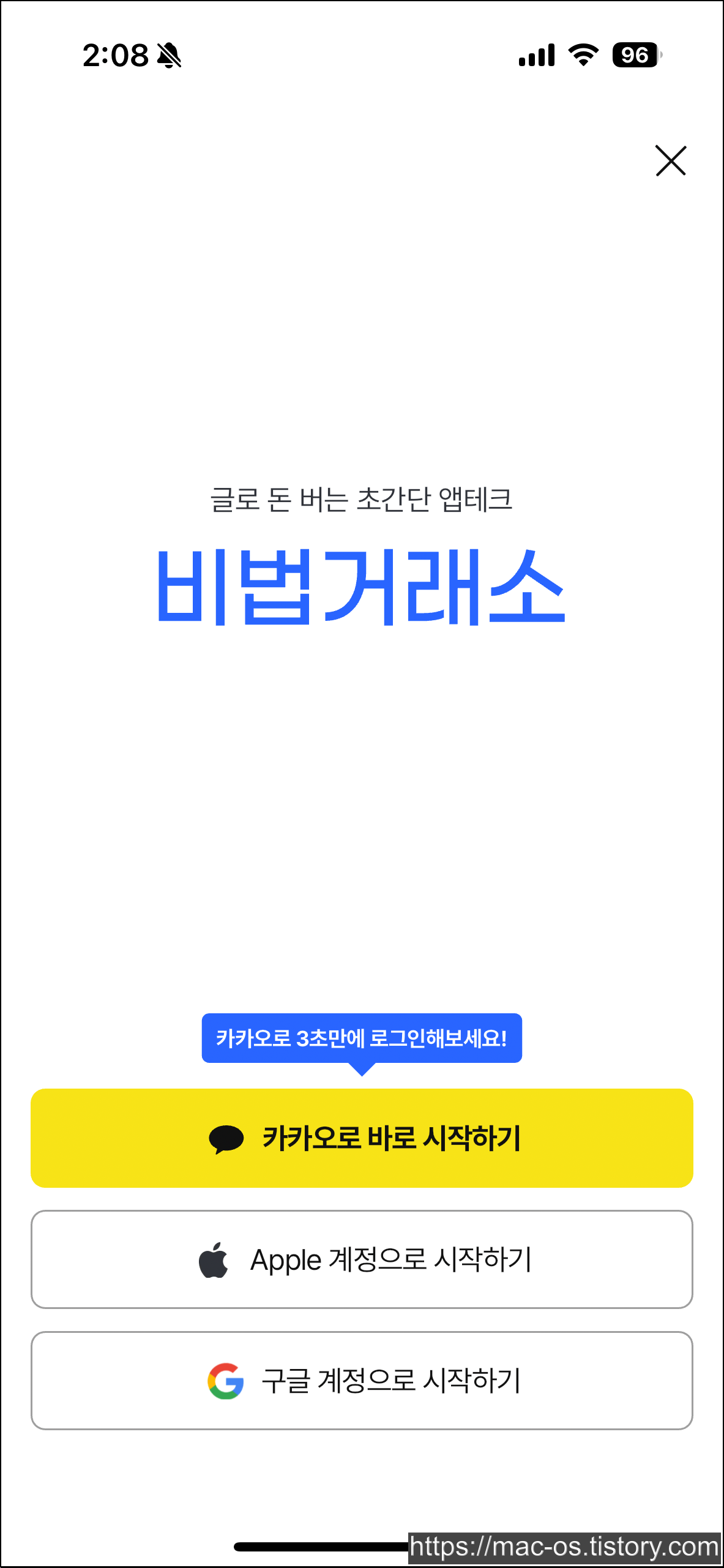 비법거래소는 카카오톡, 애플, 구글 계정으로 로그인해서 가입할 수 있습니다. 저는 카카오톡 계정으로 시작했습니다.