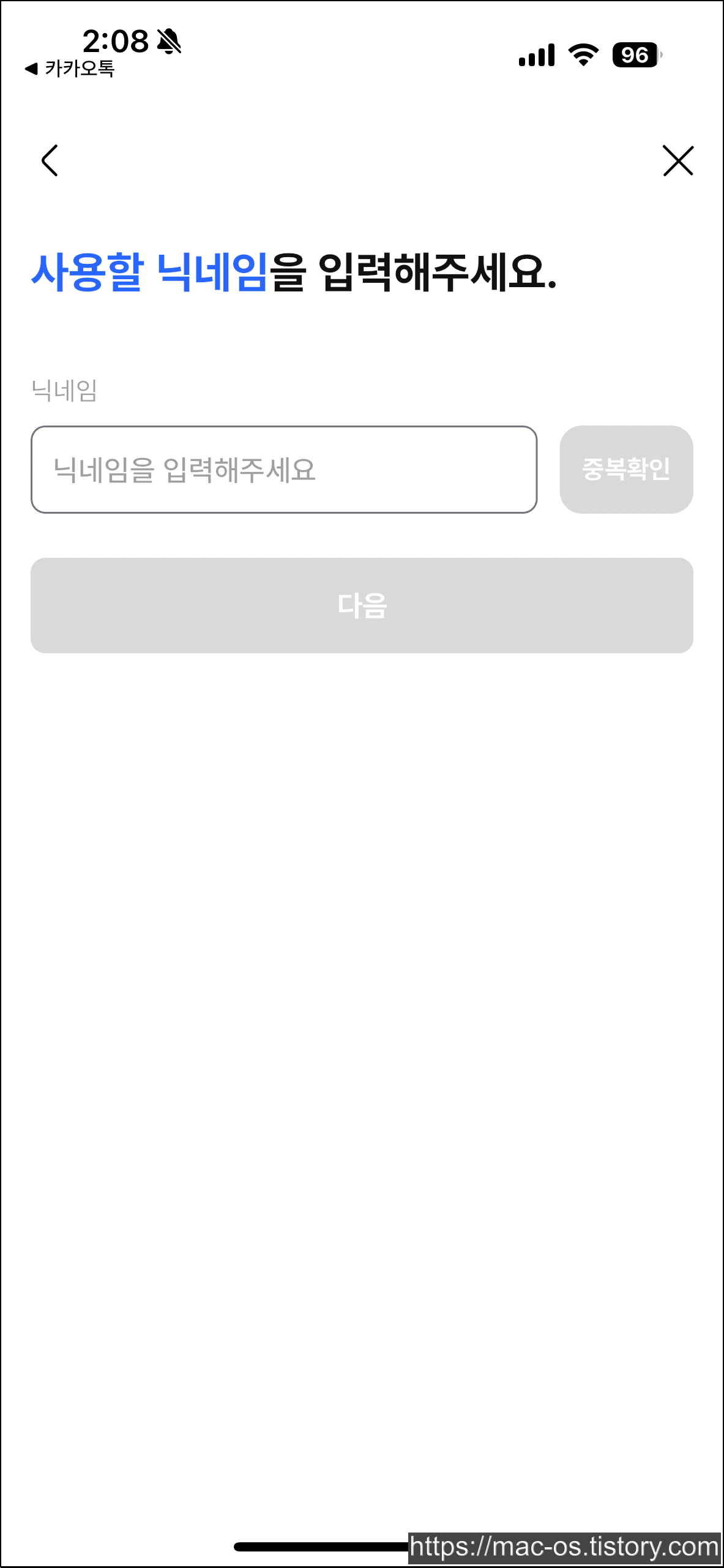 약관 동의 페이지에서 필수를 체크하고 사용할 닉네임을 입력합니다.