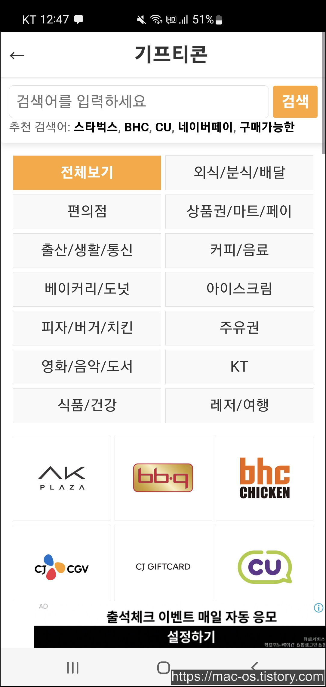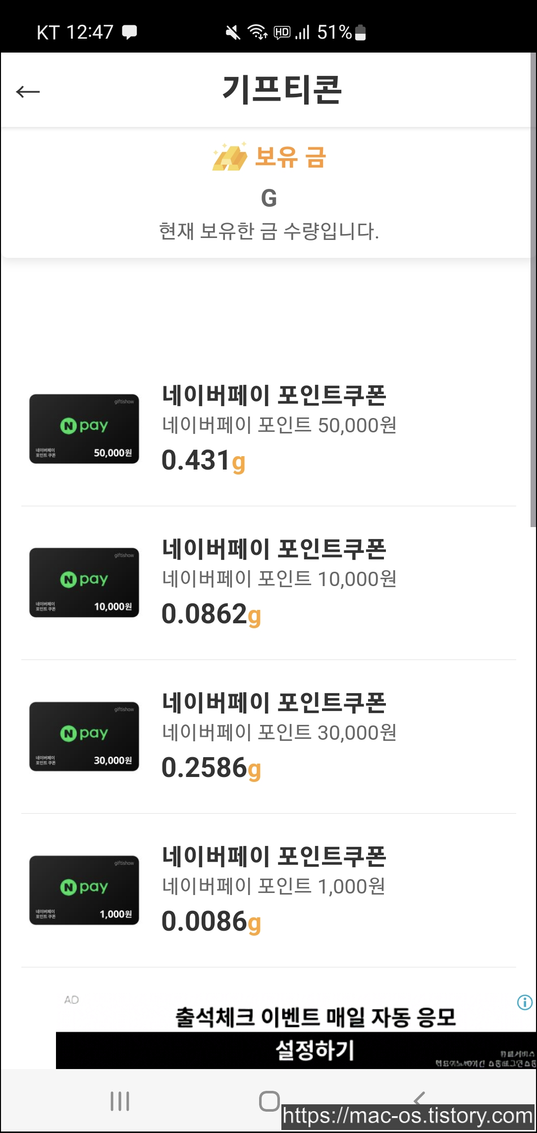 아니면 모은 금으로 기프티콘을 구매해도 된다. 12만원 기준으로 계산해보면 0.431g에 51700원 정도인데 어느정도 시세 차이가 있긴 한데 나쁘지 않다.