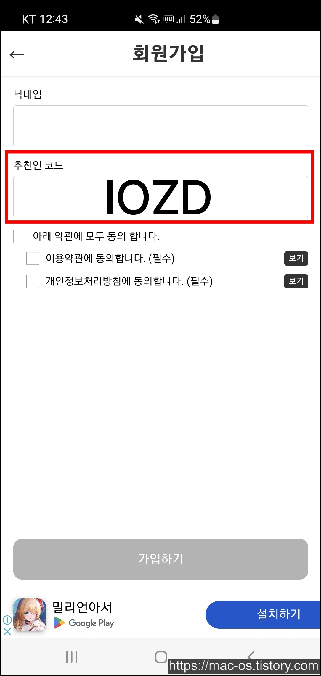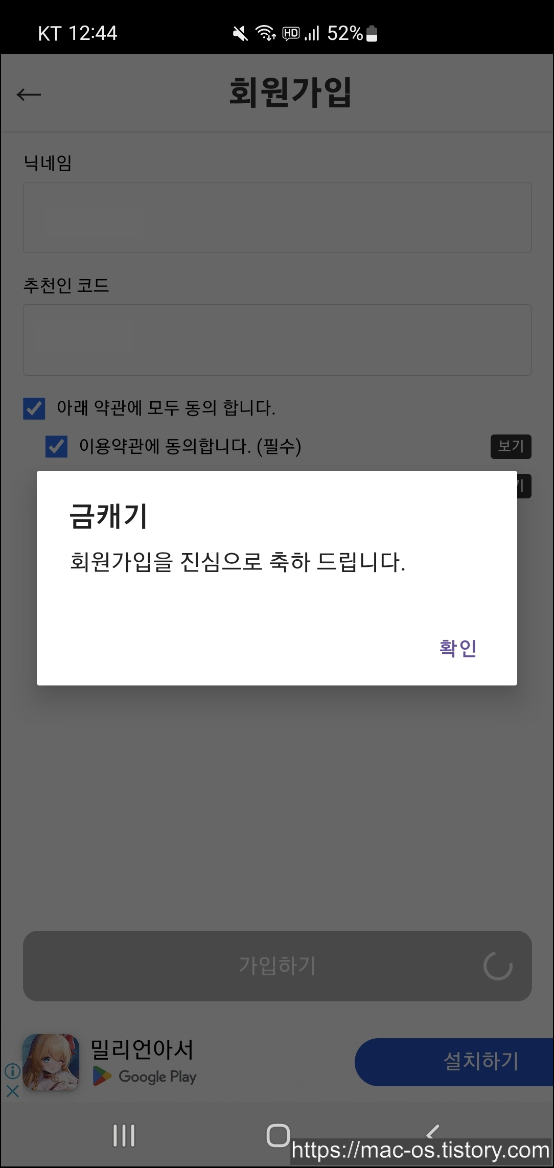 카카오 계정으로 로그인하고 닉네임과 추천인을 입력한다. 여기서 추천인 코드에 IOZD를 입력하면 금을 캐는 속도가 30일동안 300% 증가하는 채굴기를 받을 수 있다.