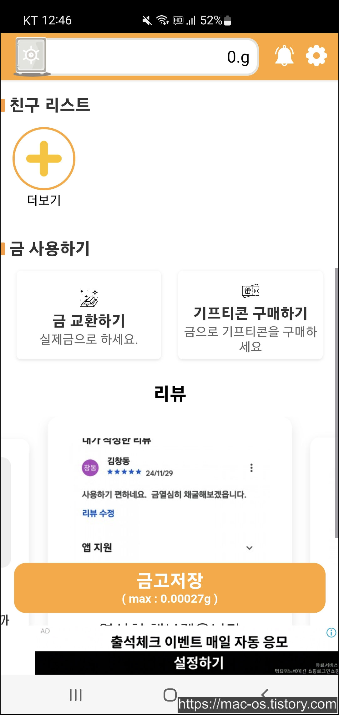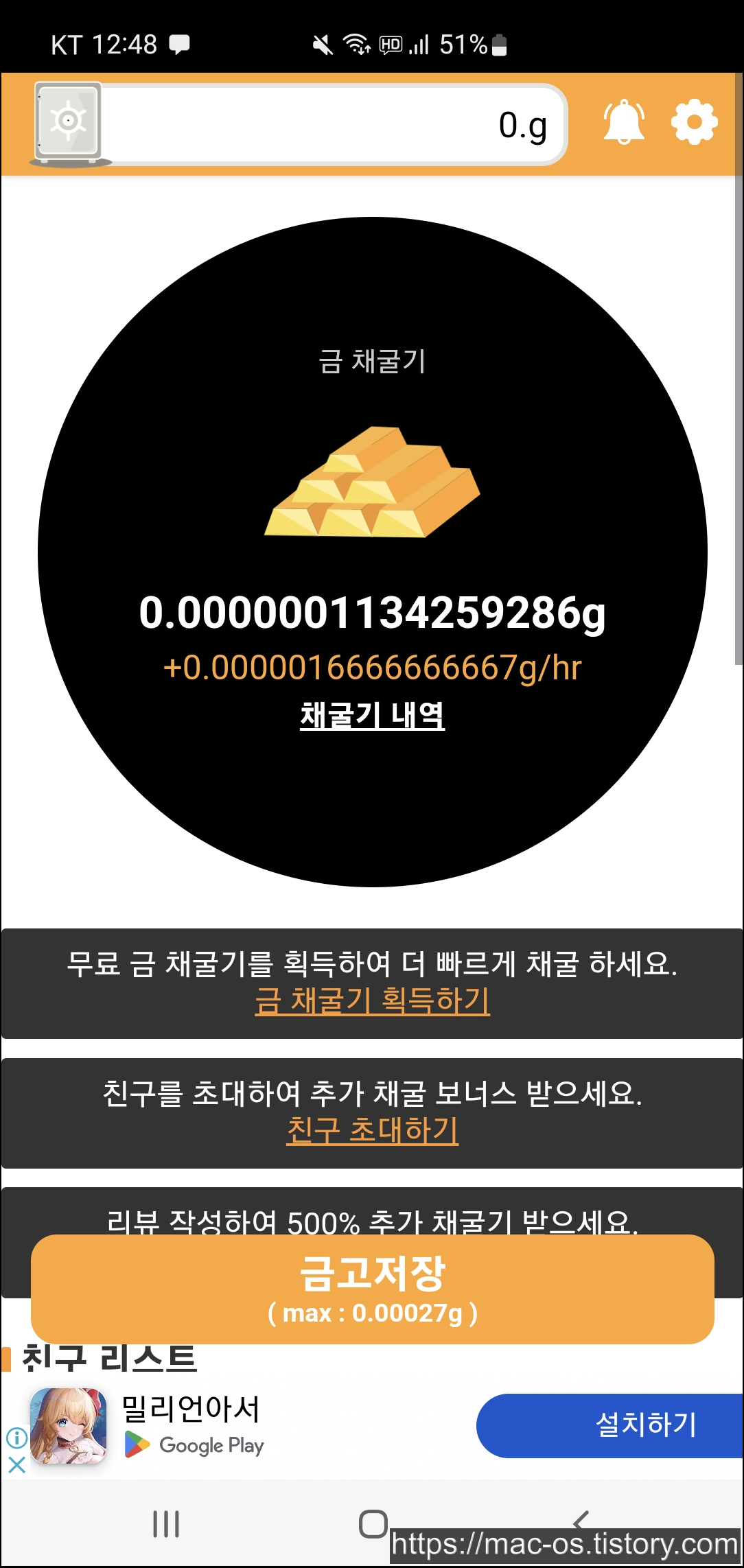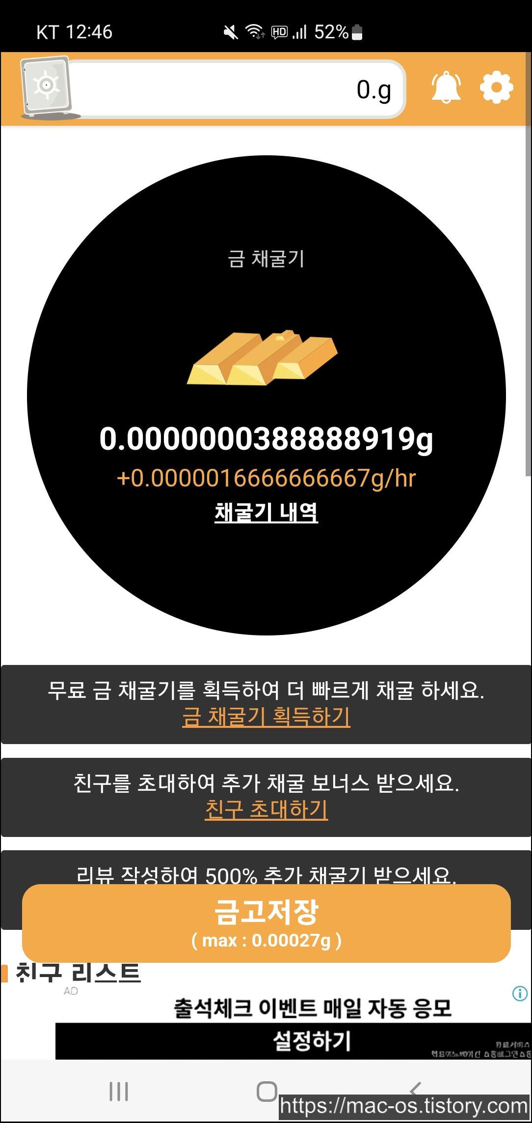회원가입을 하면 홈 화면에서 자동으로 금이 캐지는 것을 볼 수 있다.