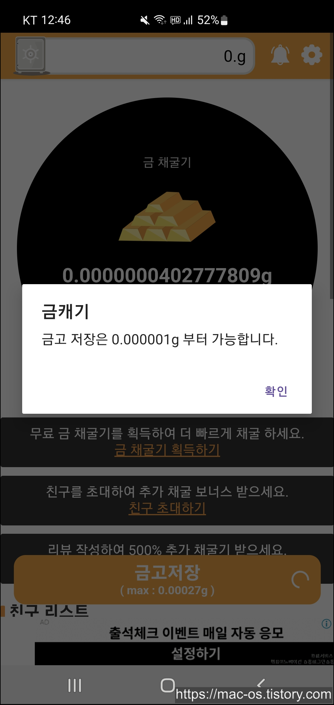 금을 어느 정도 모았으면 하단의 금고 저장 버튼을 눌러서 금을 저장할 수 있다. 신규회원 400% 채굴속도 기준으로 40분 정도 채굴하면 금을 저장할 수 있다.