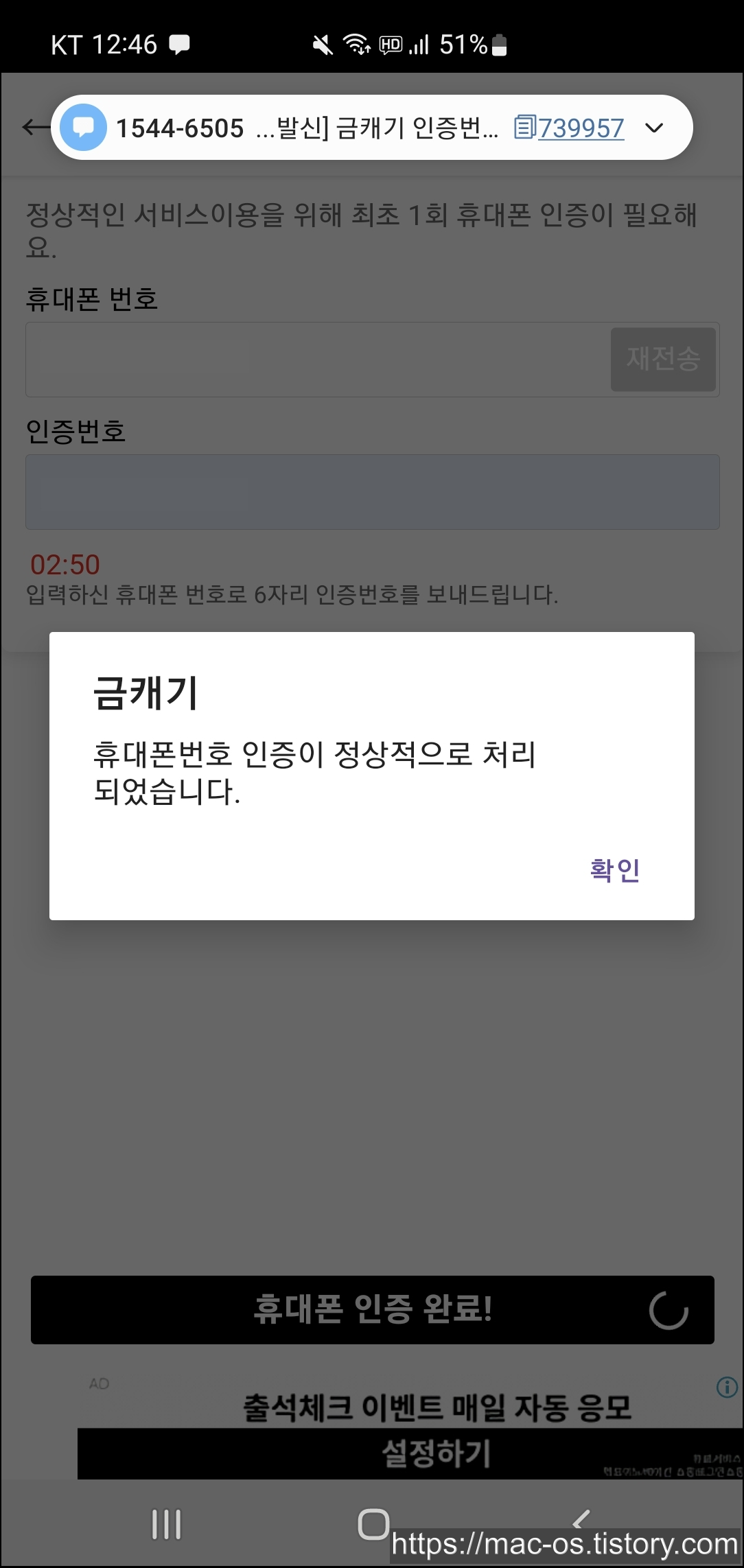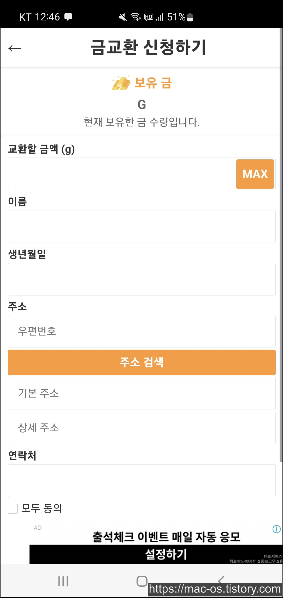 휴대폰번호 인증을 하고 나면 회원정보와 주소를 입력하고 모은 금을 실제로 받을 수 있다.