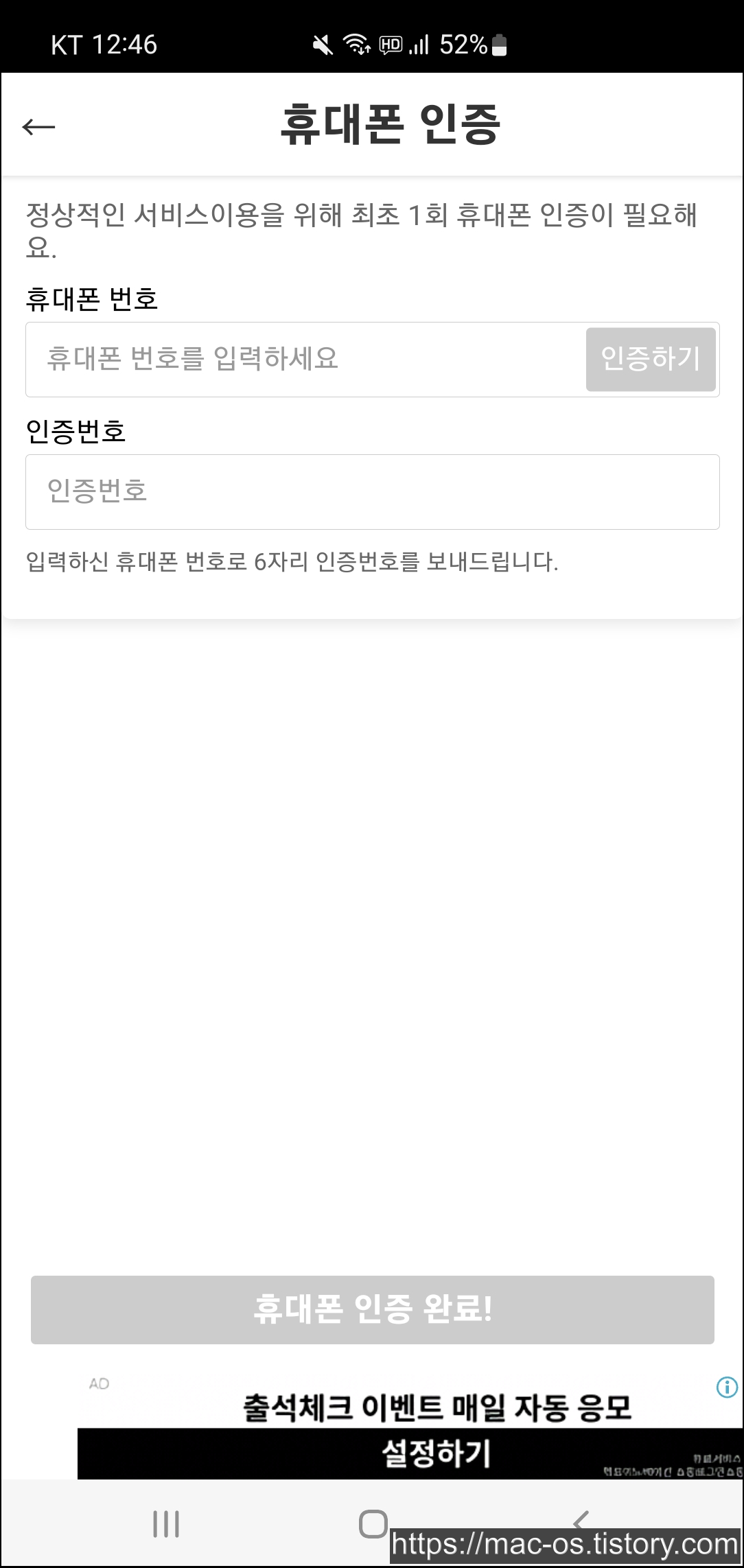 금 교환하기 페이지로 이동하면 휴대폰 번호를 입력하고 휴대폰 인증을 처음 해야 한다.