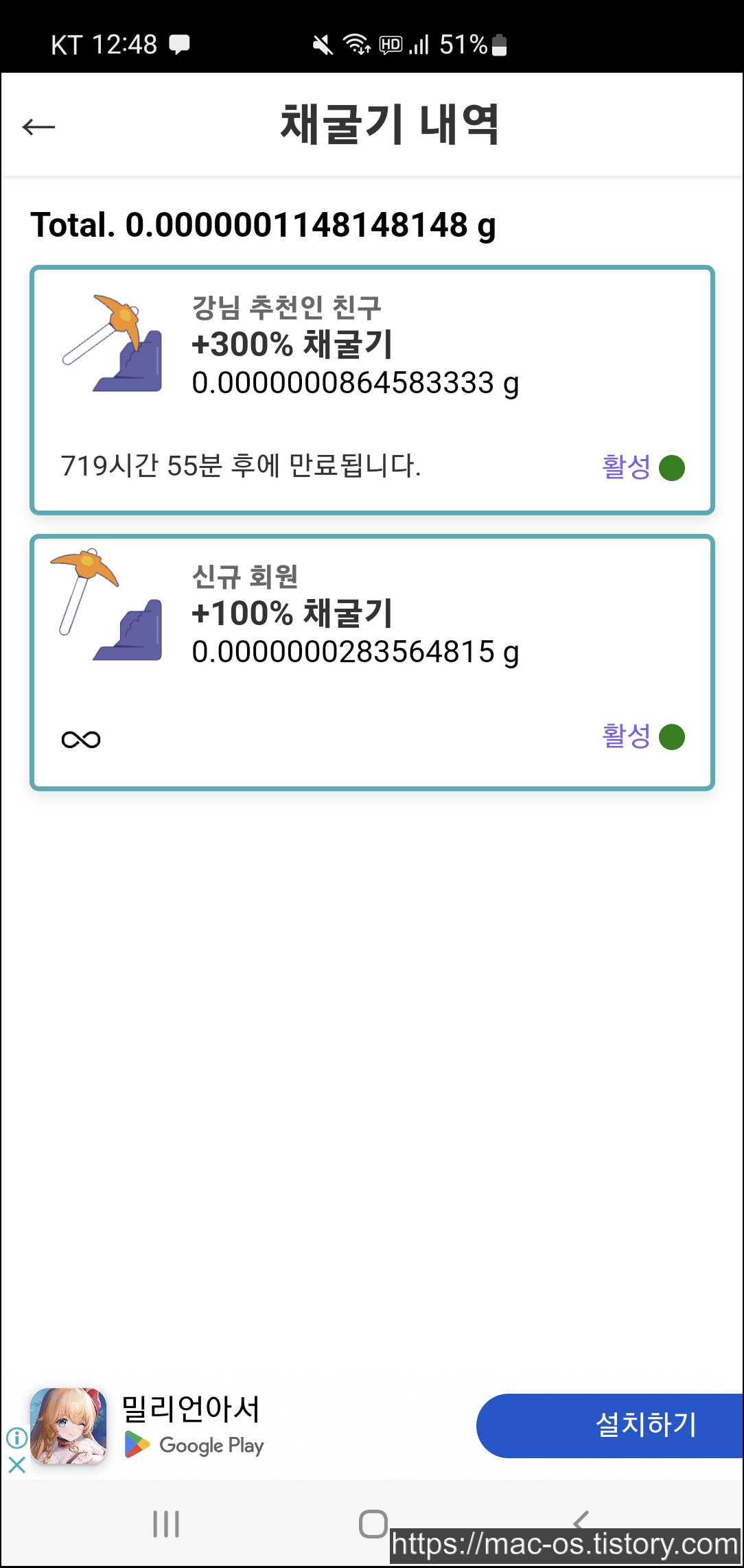 채굴기 내역 페이지를 보면 추천인을 입력해서 받은 300% 채굴기와 신규회원 100% 채굴기 2개가 있다.