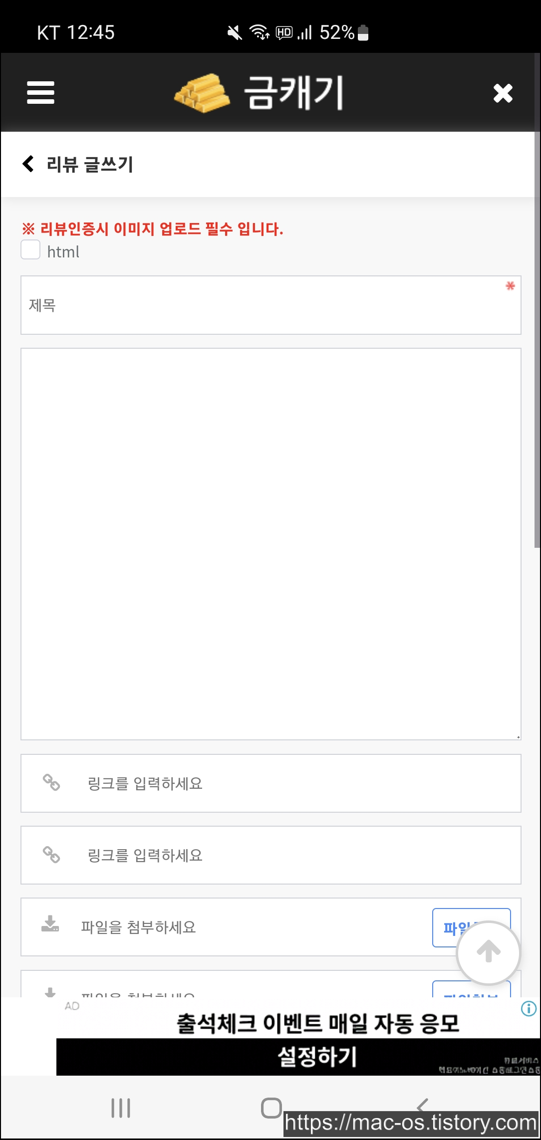 그리고 구글 플레이 스토어에서 금캐기 리뷰를 작성한 사진을 리뷰 글쓰기에 올리면 500% 채굴기를 준다.